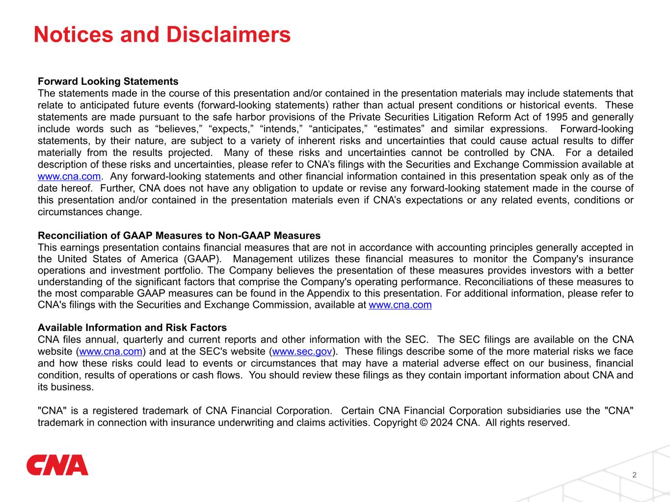 These earnings remarks include statements that relate to anticipated future events (forward-looking statements) rather than actual present conditions or historical events. These statements are made pursuant to the safe harbor provisions of the Private Securities Litigation Reform Act of 1995 and generally include words such as “believes,” “expects,” “intends,” “anticipates,” “estimates” and similar expressions. Forward-looking statements, by their nature, are subject to a variety of inherent risks and uncertainties that could cause actual results to differ materially from the results projected. Many of these risks and uncertainties cannot be controlled by CNA. For a detailed description of these risks and uncertainties, please refer to CNA’s filings with the Securities and Exchange Commission, available at www.cna.com.
