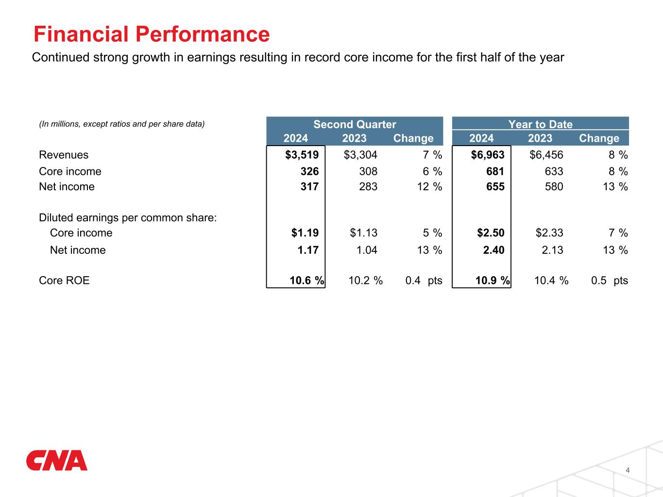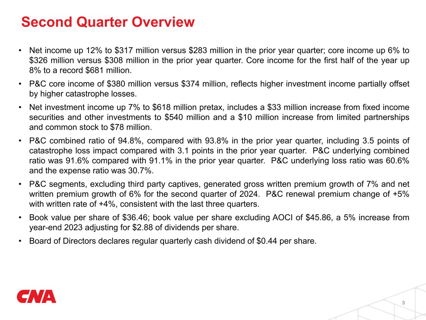 CHICAGO, July 29, 2024 --- CNA Financial Corporation (NYSE: CNA) today announced second quarter 2024 net income of $317 million, or $1.17 per share, versus $283 million, or $1.04 per share, in the prior year quarter. Net investment losses for the quarter were $9 million compared to $25 million in the prior year quarter. Core income for the quarter was $326 million, or $1.19 per share, versus $308 million, or $1.13 per share, in the prior year quarter.