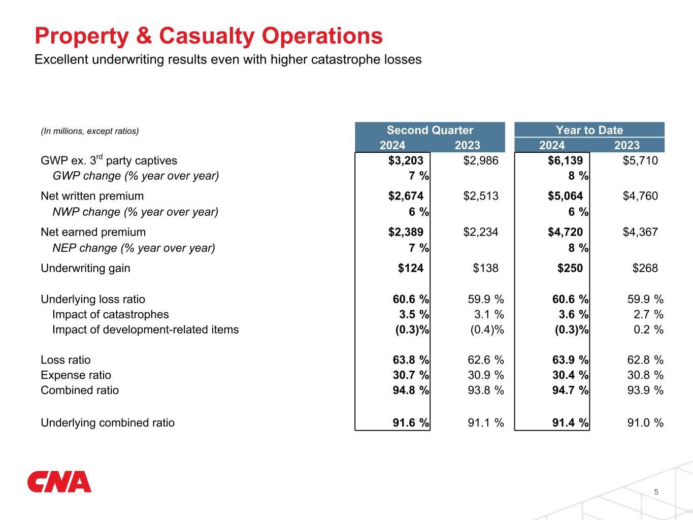 •P&C segments, excluding third party captives, generated gross written premium growth of 7% and net written premium growth of 6% for the second quarter of 2024. P&C renewal premium change of +5% with written rate of +4%, consistent with the last two quarters.