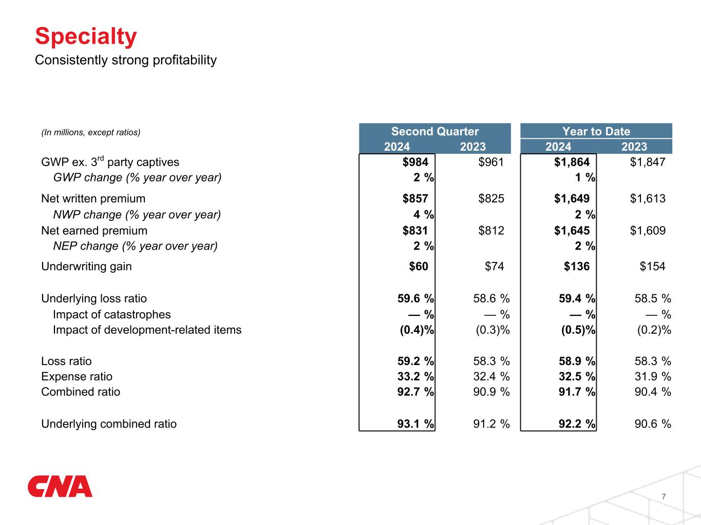 Property & Casualty Production Metrics Stable retention and rate, and record new business 6 Property & Casualty Rate & Retention 2023 2024 Q1 Q2 Q3 Q4 Q1 Q2 5% 5% 5% 4% 4% 4% 7% 7% 6% 5% 6% 5% 86% 86% 84% 85% 85% 85% Retention Renewal Premium Change Rate GWP ex. 3rd party captives ($M) $2,724 $2,986 $2,595 $2,974 $2,936 $3,203 New Business ($M) $503 $555 $475 $547 $529 $595 Specialty Rate 2% (1)% 1% —% 2% —% Retention 88% 89% 87% 89% 88% 90% Commercial Rate 7% 8% 8% 7% 6% 7% Retention 86% 85% 83% 83% 85% 84% International Rate 4% 4% 2% 2% 1% —% Retention 83% 83% 84% 83% 82% 80%