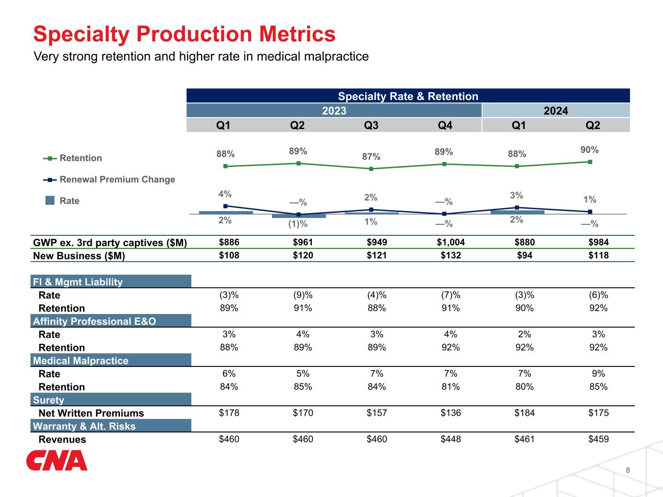 Specialty Consistently strong profitability 7 (In millions, except ratios) Second Quarter Year to Date 2024 2023 2024 2023 GWP ex. 3rd party captives $984 $961 $1,864 $1,847 GWP change (% year over year) 2 % 1 % Net written premium $857 $825 $1,649 $1,613 NWP change (% year over year) 4 % 2 % Net earned premium $831 $812 $1,645 $1,609 NEP change (% year over year) 2 % 2 % Underwriting gain $60 $74 $136 $154 Underlying loss ratio 59.6 % 58.6 % 59.4 % 58.5 % Impact of catastrophes — % — % — % — % Impact of development-related items (0.4) % (0.3) % (0.5) % (0.2) % Loss ratio 59.2 % 58.3 % 58.9 % 58.3 % Expense ratio 33.2 % 32.4 % 32.5 % 31.9 % Combined ratio 92.7 % 90.9 % 91.7 % 90.4 % Underlying combined ratio 93.1 % 91.2 % 92.2 % 90.6 %