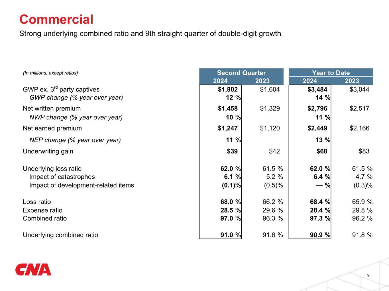 Turning to our three segments, the all-in combined ratio for Commercial was 97.0%. Catastrophe losses of $76 million this quarter added 6.1 points to the combined ratio. The underlying combined ratio of 91.0% was 0.6 points lower than the prior year quarter. The underlying loss ratio was 62.0% and the expense ratio was 28.5%. The underlying underwriting gain of $115 million in Commercial was a record high.