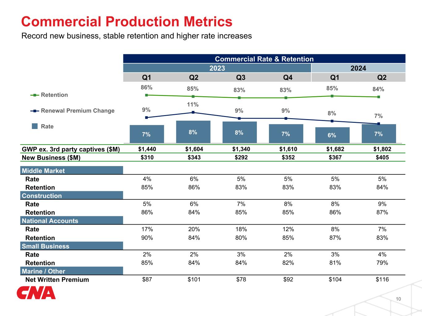 Gross written premium ex. captives was up 7%, including continued strong growth in Commercial of 12%. Net written premium was up 6%. New business grew 7% to a record high. The overall P&C retention remained strong at 85% for the quarter. Overall rate change remained stable at 4%, but improved one point to 7% in Commercial. In classes with higher loss cost trends like auto and excess casualty, written rate change continues to be low double-digit, exceeding their long run loss cost trends.