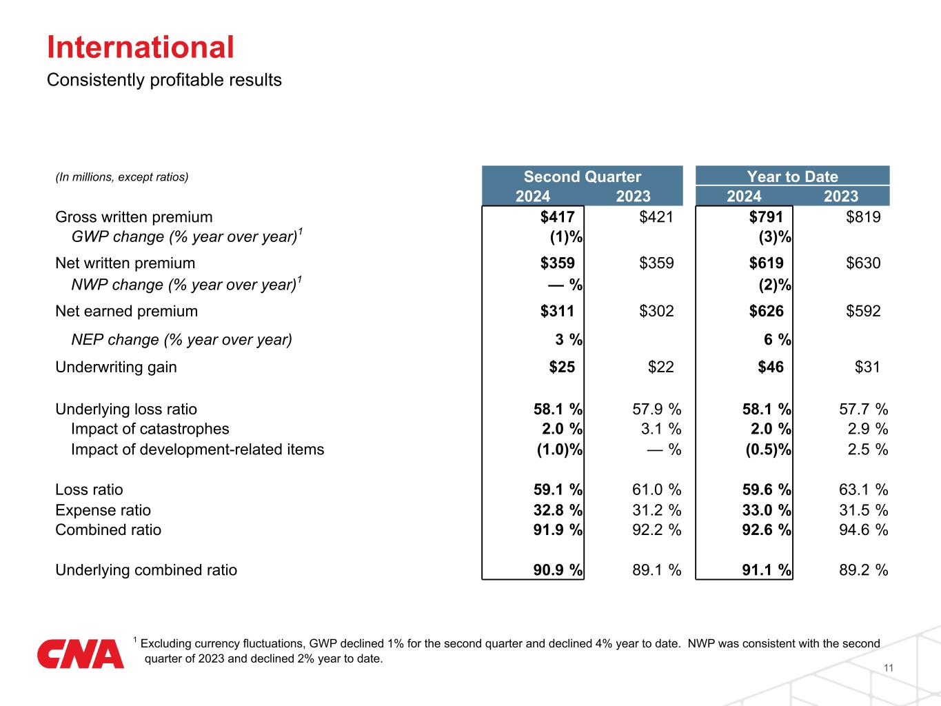 For International, the all-in combined ratio was 91.9% in the quarter, including $6 million or 2.0 points of catastrophe losses. The underlying combined ratio was 90.9% with an underlying loss ratio of 58.1%, and the expense ratio was 32.8%. The underlying combined ratio in International has been below 92% for three consecutive years.