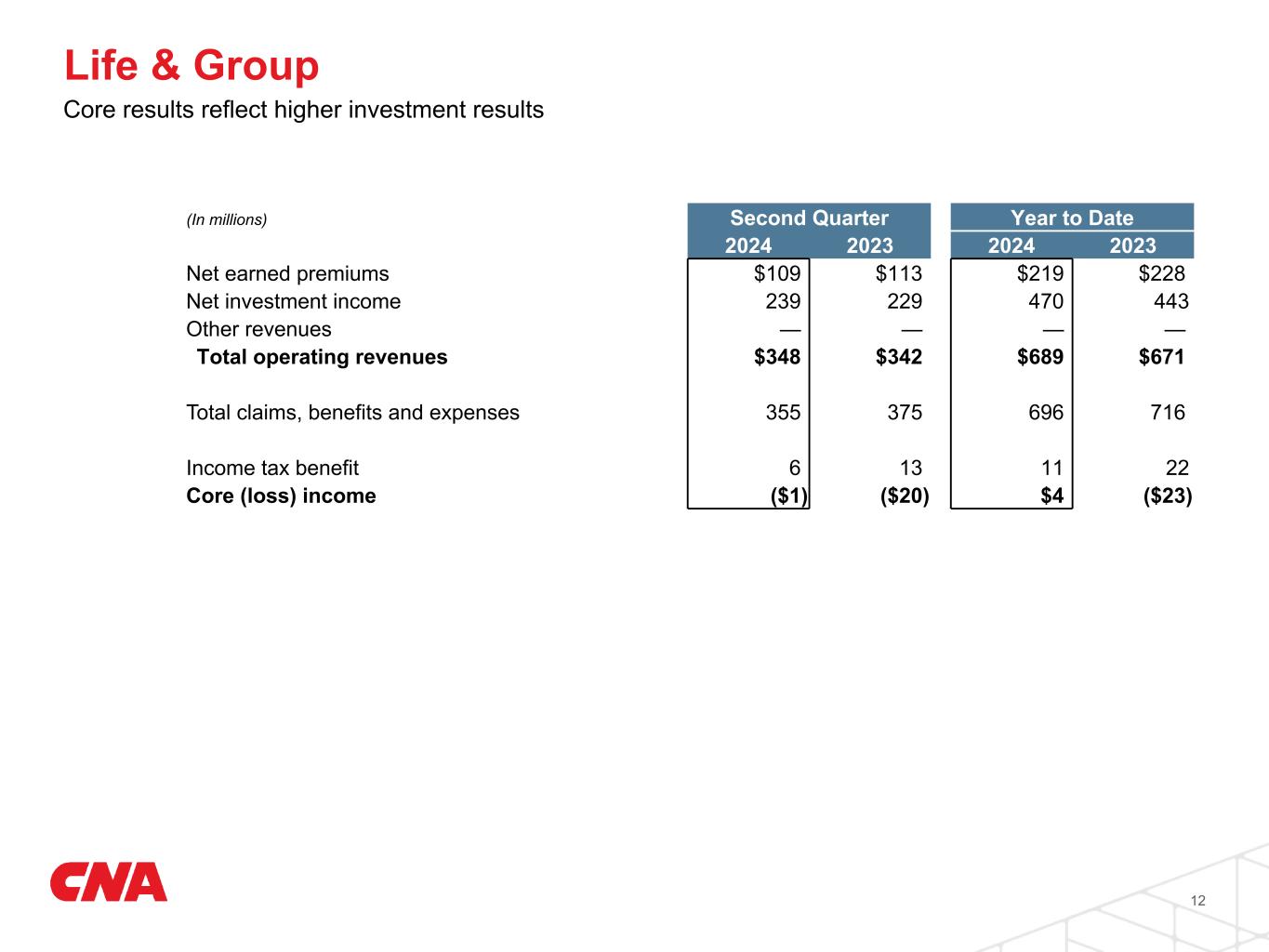 Life & Group Core results reflect higher investment results 12 (In millions) Second Quarter Year to Date 2024 2023 2024 2023 Net earned premiums $109 $113 $219 $228 Net investment income 239 229 470 443 Other revenues — — — — Total operating revenues $348 $342 $689 $671 Total claims, benefits and expenses 355 375 696 716 Income tax benefit 6 13 11 22 Core (loss) income ($1) ($20) $4 ($23)