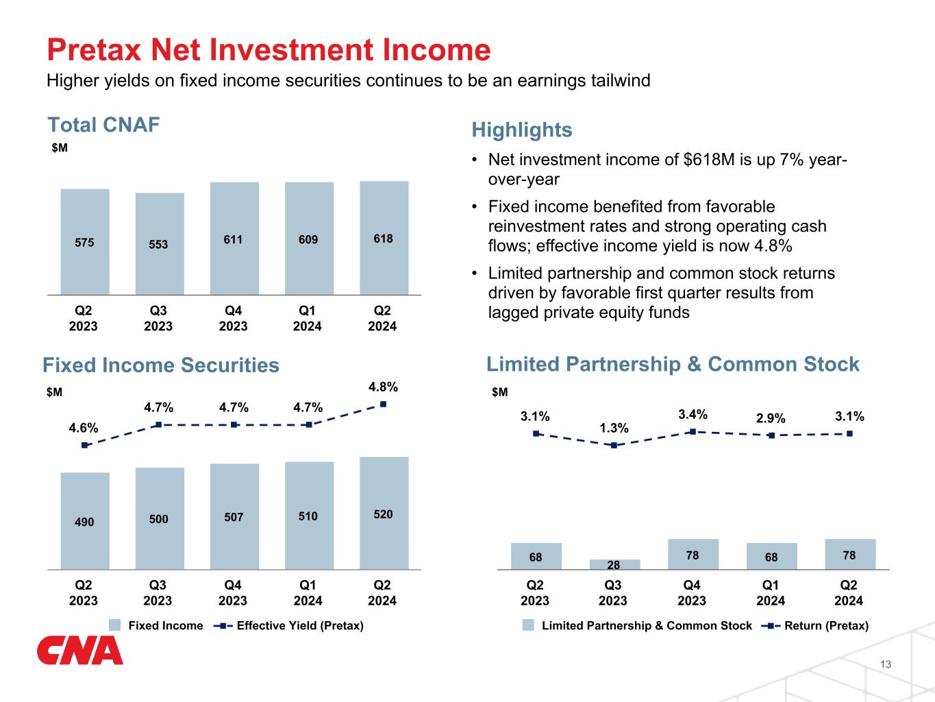 •Net investment income up 7% to $618 million pretax, includes a $33 million increase from fixed income securities and other investments to $540 million and a $10 million increase from limited partnerships and common stock to $78 million.
