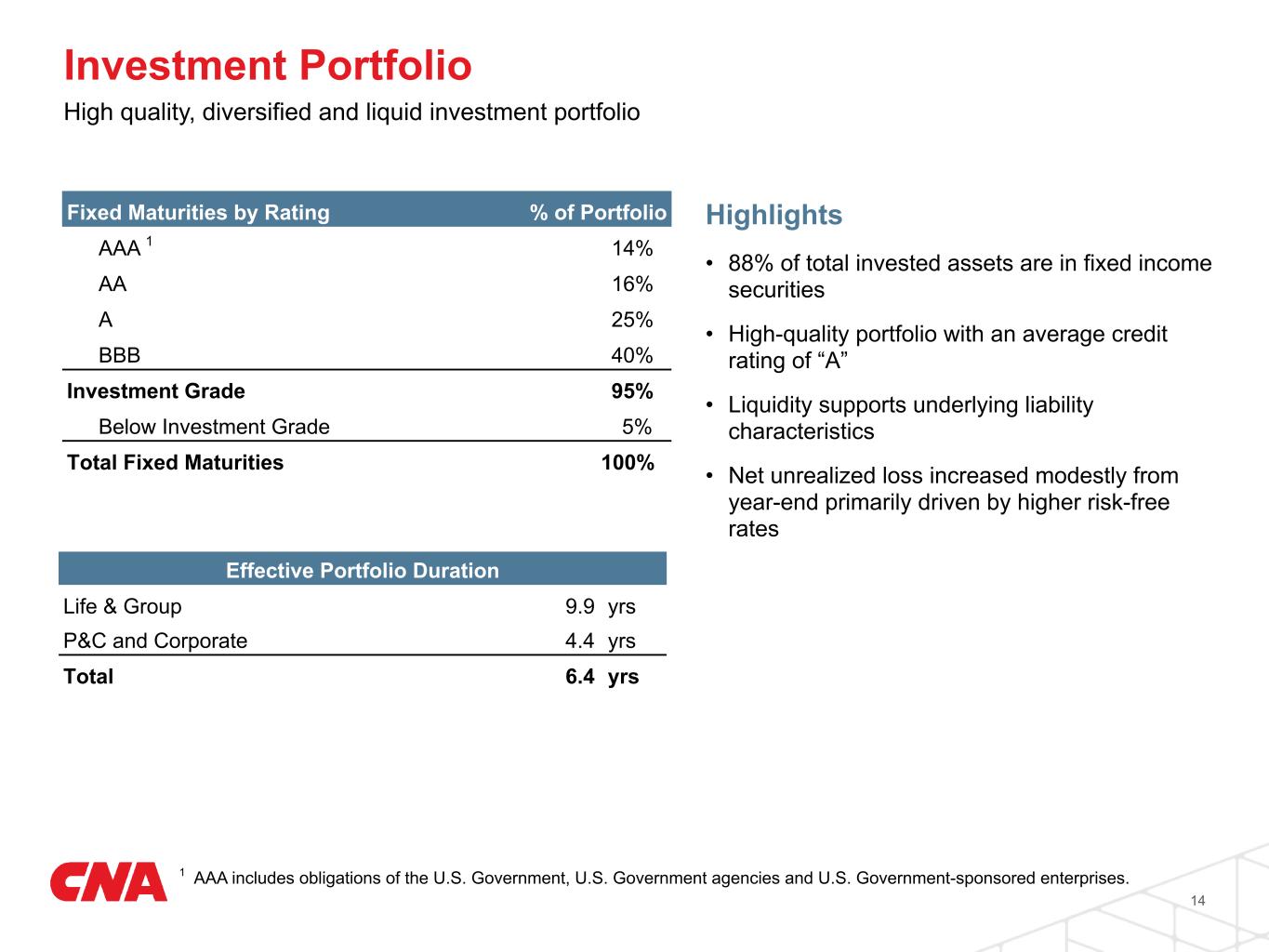 Highlights • 88% of total invested assets are in fixed income securities • High-quality portfolio with an average credit rating of “A” • Liquidity supports underlying liability characteristics • Net unrealized loss increased modestly from year-end primarily driven by higher risk-free rates Investment Portfolio Effective Portfolio Duration Life & Group 9.9 yrs P&C and Corporate 4.4 yrs Total 6.4 yrs Fixed Maturities by Rating % of Portfolio AAA 1 14% AA 16% A 25% BBB 40% Investment Grade 95% Below Investment Grade 5% Total Fixed Maturities 100% 14 1 AAA includes obligations of the U.S. Government, U.S. Government agencies and U.S. Government-sponsored enterprises. High quality, diversified and liquid investment portfolio