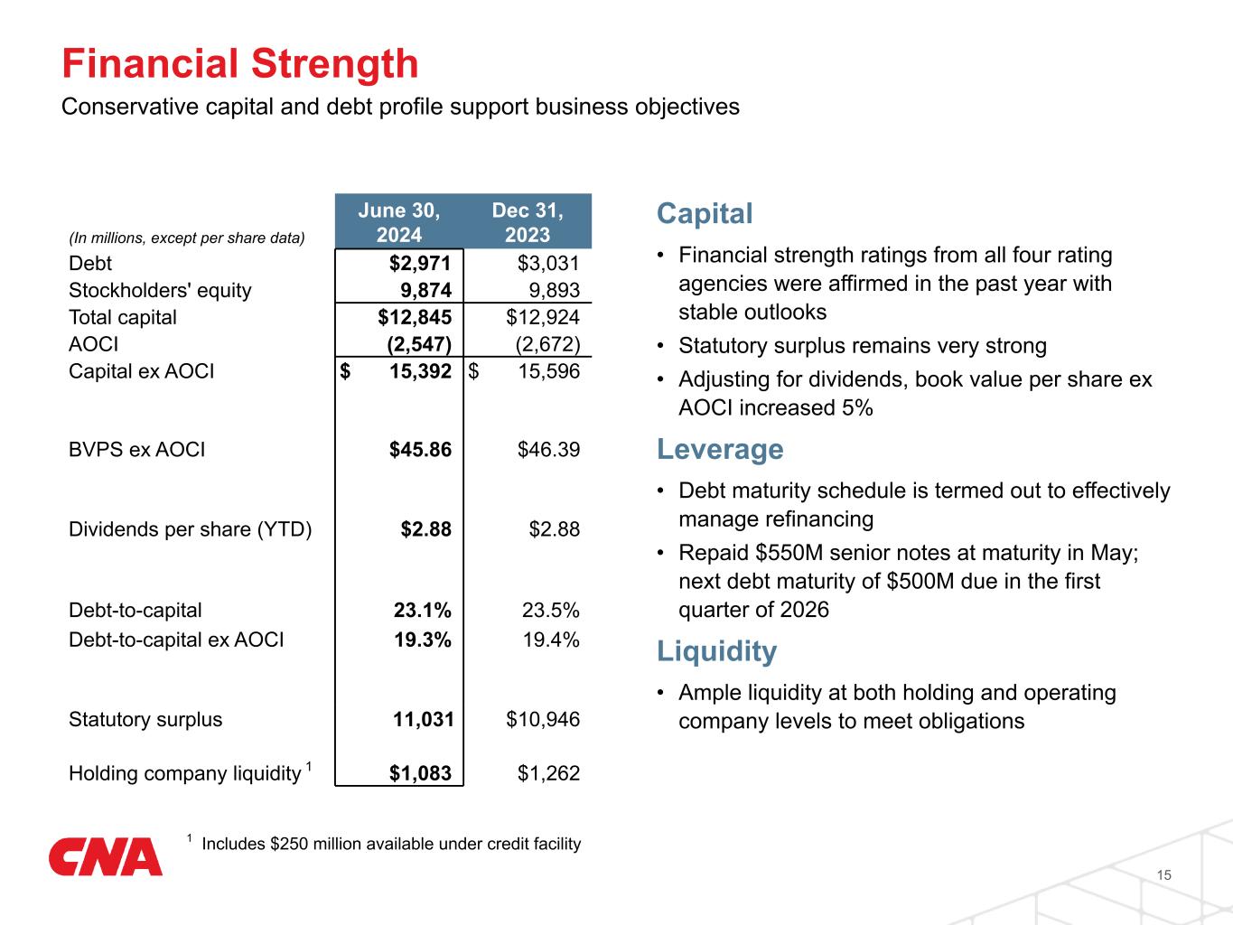 At quarter end, our balance sheet continues to be very solid with stockholders’ equity excluding AOCI of $12.4 billion, or $45.86 per share, an increase of 5% from year-end 2023 after adjusting for dividends. Stockholders’ equity including AOCI was $9.9 billion or $36.46 per share, at June 30, 2024. As a result of rising interest rates during the quarter, the net unrealized loss in our fixed income portfolio is now at $2.6 billion as of quarter-end. During the quarter, $550 million of senior notes matured, bringing our debt to capital excluding AOCI to just under 20%. Our next debt maturity of $500 million is due in the first quarter of 2026. Finally, we ended the quarter with statutory capital and surplus in the combined Continental Casualty Companies of $11.0 billion, which is about flat with year-end 2023.