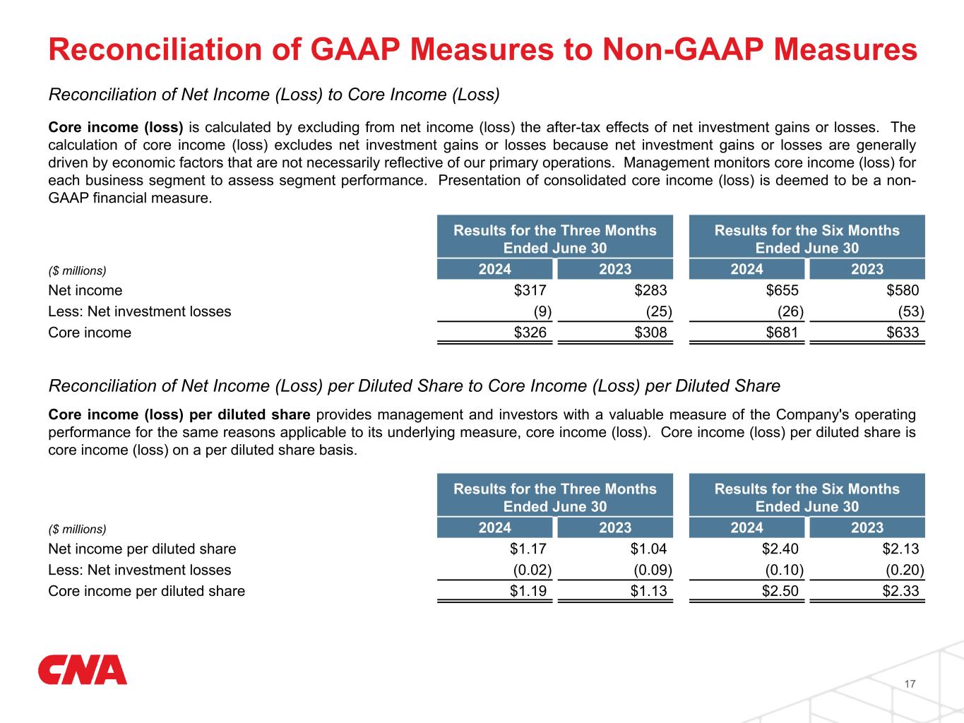 Reconciliation of Net Income (Loss) to Core Income (Loss) Results for the Three Months Ended June 30 Results for the Six Months Ended June 30 ($ millions) 2024 2023 2024 2023 Net income $317 $283 $655 $580 Less: Net investment losses (9) (25) (26) (53) Core income $326 $308 $681 $633 Core income (loss) is calculated by excluding from net income (loss) the after-tax effects of net investment gains or losses. The calculation of core income (loss) excludes net investment gains or losses because net investment gains or losses are generally driven by economic factors that are not necessarily reflective of our primary operations. Management monitors core income (loss) for each business segment to assess segment performance. Presentation of consolidated core income (loss) is deemed to be a non- GAAP financial measure. Reconciliation of Net Income (Loss) per Diluted Share to Core Income (Loss) per Diluted Share Results for the Three Months Ended June 30 Results for the Six Months Ended June 30 ($ millions) 2024 2023 2024 2023 Net income per diluted share $1.17 $1.04 $2.40 $2.13 Less: Net investment losses (0.02) (0.09) (0.10) (0.20) Core income per diluted share $1.19 $1.13 $2.50 $2.33 Core income (loss) per diluted share provides management and investors with a valuable measure of the Company's operating performance for the same reasons applicable to its underlying measure, core income (loss). Core income (loss) per diluted share is core income (loss) on a per diluted share basis. 17 Reconciliation of GAAP Measures to Non-GAAP Measures