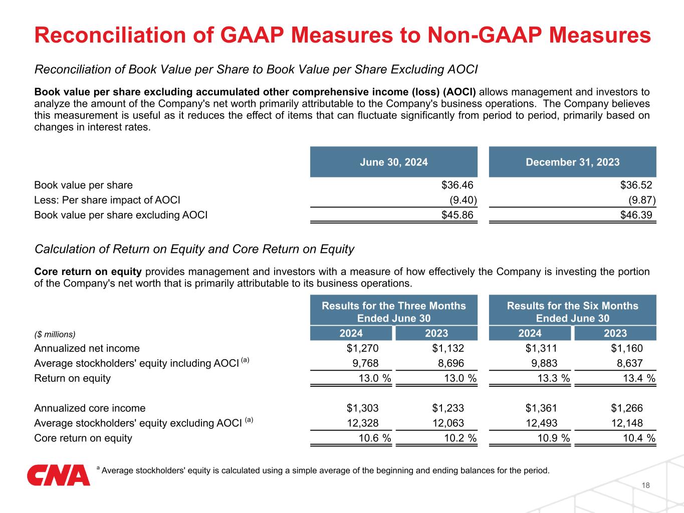 Reconciliation of Book Value per Share to Book Value per Share Excluding AOCI June 30, 2024 December 31, 2023 Book value per share $36.46 $36.52 Less: Per share impact of AOCI (9.40) (9.87) Book value per share excluding AOCI $45.86 $46.39 Book value per share excluding accumulated other comprehensive income (loss) (AOCI) allows management and investors to analyze the amount of the Company's net worth primarily attributable to the Company's business operations. The Company believes this measurement is useful as it reduces the effect of items that can fluctuate significantly from period to period, primarily based on changes in interest rates. Calculation of Return on Equity and Core Return on Equity Results for the Three Months Ended June 30 Results for the Six Months Ended June 30 ($ millions) 2024 2023 2024 2023 Annualized net income $1,270 $1,132 $1,311 $1,160 Average stockholders' equity including AOCI (a) 9,768 8,696 9,883 8,637 Return on equity 13.0 % 13.0 % 13.3 % 13.4 % Annualized core income $1,303 $1,233 $1,361 $1,266 Average stockholders' equity excluding AOCI (a) 12,328 12,063 12,493 12,148 Core return on equity 10.6 % 10.2 % 10.9 % 10.4 % Core return on equity provides management and investors with a measure of how effectively the Company is investing the portion of the Company's net worth that is primarily attributable to its business operations. a Average stockholders' equity is calculated using a simple average of the beginning and ending balances for the period. 18 Reconciliation of GAAP Measures to Non-GAAP Measures