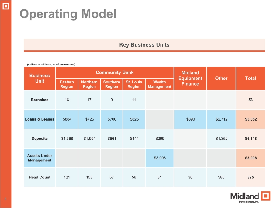 7 Business and Corporate Strategy MSBI's Five Strategic Elements Superior Customer Experience We value the customer in everything we do, and we find satisfaction in knowing our contributions make a difference. 7 Process Excellence We are continuously improving our processes to enhance efficiency, accuracy, and speed. By streamlining workflows and leveraging best practices, we aim to deliver services more effectively and increase customer satisfaction. High - Tech, High - Touch We blend cutting - edge technology with genuine personal connections, ensuring a seamless experience across all channels for all our customers. One Midland Culture One company. One culture. One team. One Midland represents our cohesive team that thinks first in terms of team results rather than individual gain. Our employees are empowered with fulfilling careers and continuous growth. High Performing Bank We set bold goals, measure our progress, and adapt our strategies to ensure long - term success and stability. Our efforts to achieve superior financial performance are centered on driving revenue, managing costs, and maximizing shareholder value.