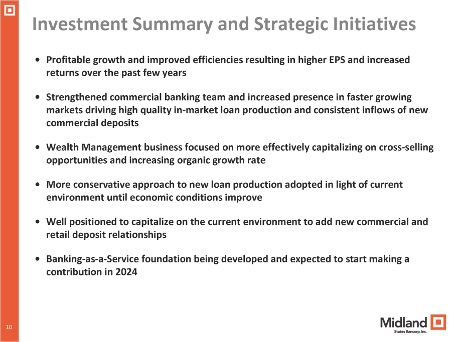 9 Experienced Senior Management Team Jeffrey G. Ludwig President and CEO of Midland States Bancorp ▪ Assumed Company CEO role in Jan. 2019 after serving as Bank CEO ▪ More than 10 years serving as CFO ▪ Joined Midland in 2006; 16+ years in banking industry Jeffrey S. Mefford President of Midland States Bank and EVP of Midland States Bancorp ▪ Joined Midland in 2003 ▪ Appointed Bank President in March 2018 ▪ Oversees all sales activities for commercial, retail, mortgage, wealth management, equipment finance, and treasury management Douglas J. Tucker SVP, Corporate Counsel and Director of IR ▪ 20+ years experience advising banks and bank holding companies ▪ Significant IPO, SEC reporting and M&A experience ▪ Joined Midland in 2010 Eric T. Lemke Chief Financial Officer ▪ Promoted to Chief Financial Officer in November 2019 ▪ Joined Midland in 2018 as Director of Assurance and Audit ▪ 25+ years of financial accounting and reporting experience in financial services Daniel E. Casey Chief Risk Officer ▪ 30+ years in risk and investment management ▪ Administers enterprise risk management functions including compliance management, loan review, internal audit and other fiduciary safeguards ▪ Joined Midland in 2023 Jeffrey A. Brunoehler Chief Credit Officer ▪ 30+ years in banking, lending and credit ▪ Leads the credit underwriting, approval and loan portfolio management functions ▪ Joined Midland in 2010 9