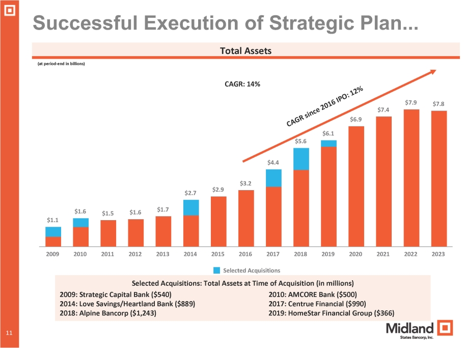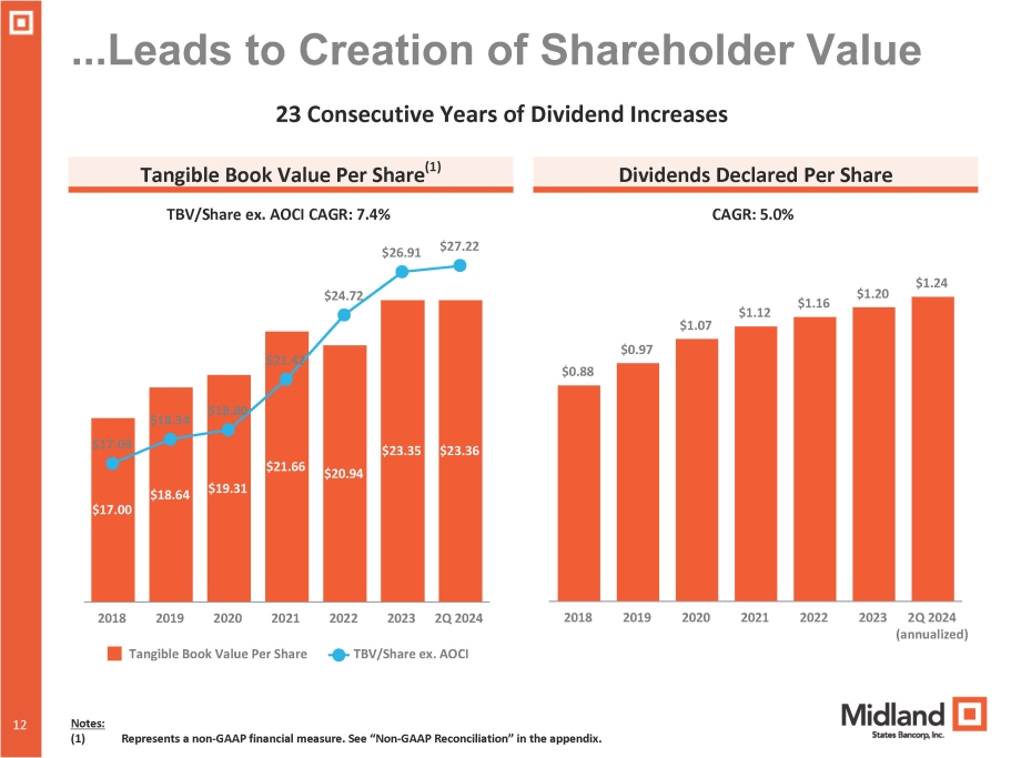Successful Execution of Strategic Plan... Total Assets (at period - end in billions) $1.1 $1.6 $1.5 $1.6 $1.7 $2.7 $2.9 $6.1 $5.6 $4.4 $3.2 $7.4 $6.9 $7.9 $7.8 2015 2016 2017 Selected Acquisitions 2009 2010 2011 2012 2013 2014 2018 2019 2020 2021 2022 2023 10 11 CAGR: 14% Selected Acquisitions: Total Assets at Time of Acquisition (in millions) 2009: Strategic Capital Bank ($540) 2010: AMCORE Bank ($500) 2014: Love Savings/Heartland Bank ($889) 2017: Centrue Financial ($990) 2018: Alpine Bancorp ($1,243) 2019: HomeStar Financial Group ($366)