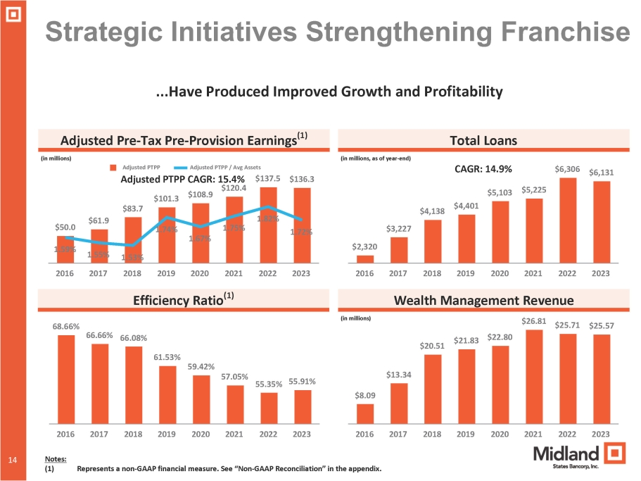 ...And Increased Profitability Adjusted Diluted EPS (1) CAGR: 6.2% Adjusted ROATCE (1) & ROAA (1) 15.00% 14.44% 9.24% 18.33% 18.59% 15.98% 6.51% 1.04% 1.08% 0.62% 1.21% 1.18% 1.08% 0.53% Adj ROATCE Adj ROAA 2018 2019 2020 2021 2022 2023 YTD 2024 $2.39 12 13 Notes: (1) Represents a non - GAAP financial measure. See “Non - GAAP Reconciliation” in the appendix. $2.54 $1.70 $3.65 $3.79 $3.42 2018 2019 2020 2021 2022 2023