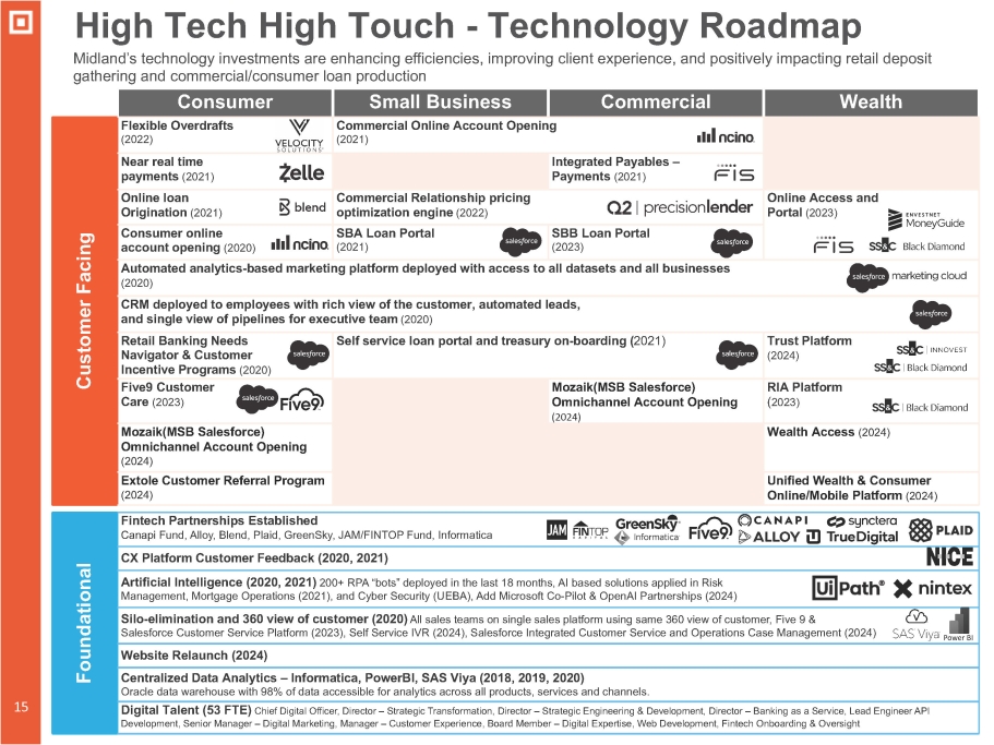 High Tech High Touch - Technology Roadmap Midland’s technology investments are enhancing efficiencies, improving client experience, and positively impacting retail deposit gathering and commercial/consumer loan production Fintech Partnerships Established Canapi Fund, Alloy, Blend, Plaid, GreenSky, JAM/FINTOP Fund, Informatica Foundational CX Platform Customer Feedback (2020, 2021) Artificial Intelligence (2020, 2021) 200+ RPA “bots” deployed in the last 18 months, AI based solutions applied in Risk Management, Mortgage Operations (2021), and Cyber Security (UEBA), Add Microsoft Co - Pilot & OpenAI Partnerships (2024) Silo - elimination and 360 view of customer (2020) All sales teams on single sales platform using same 360 view of customer, Five 9 & Salesforce Customer Service Platform (2023), Self Service IVR (2024), Salesforce Integrated Customer Service and Operations Case Management (2024) Website Relaunch (2024) Centralized Data Analytics – Informatica, PowerBI, SAS Viya (2018, 2019, 2020) Oracle data warehouse with 98% of data accessible for analytics across all products, services and channels. Digital Talent (53 FTE) Chief Digital Officer, Director – Strategic Transformation, Director – Strategic Engineering & Development, Director – Banking as a Service, Lead Engineer API Development, Senior Manager – Digital Marketing, Manager – Customer Experience, Board Member – Digital Expertise, Web Development, Fintech Onboarding & Oversight Customer Facing Wealth Commercial Small Business Consumer Commercial Online Account Opening (2021) Flexible Overdrafts (2022) Integrated Payables – Payments (2021) Near real time payments (2021) Online Access and Portal (2023) Commercial Relationship pricing optimization engine (2022) Online loan Origination (2021) SBB Loan Portal (2023) SBA Loan Portal (2021) Consumer online account opening (2020) Automated analytics - based marketing platform deployed with access to all datasets and all businesses (2020) CRM deployed to employees with rich view of the customer, automated leads, and single view of pipelines for executive team (2020) Trust Platform (2024) Self service loan portal and treasury on - boarding ( 2021) Retail Banking Needs Navigator & Customer Incentive Programs (2020) RIA Platform ( 2023) Mozaik(MSB Salesforce) Omnichannel Account Opening (2024) Five9 Customer Care (2023) Wealth Access (2024) Mozaik(MSB Salesforce) Omnichannel Account Opening (2024) Unified Wealth & Consumer Online/Mobile Platform (2024) Extole Customer Referral Program (2024) 15