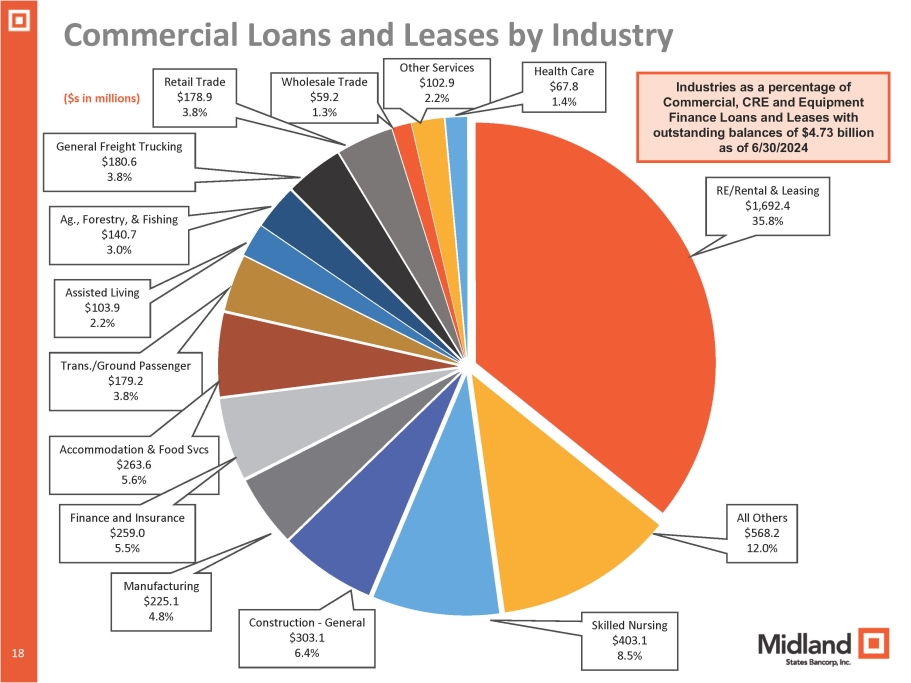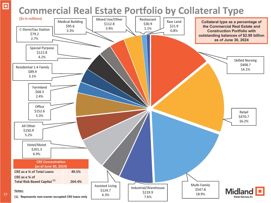 18 18 ($s in millions) RE/Rental & Leasing $1,692.4 35.8% All Others $568.2 12.0% Skilled Nursing $403.1 8.5% Construction - General $303.1 6.4% Manufacturing $225.1 4.8% Accommodation & Food Svcs $263.6 5.6% Assisted Living $103.9 2.2% Trans./Ground Passenger $179.2 3.8% Ag., Forestry, & Fishing $140.7 3.0% General Freight Trucking $180.6 3.8% Wholesale Trade $59.2 1.3% Retail Trade $178.9 3.8% Other Services $102.9 2.2% Commercial Loans and Leases by Industry Health Care $67.8 1.4% Finance and Insurance $259.0 5.5% Industries as a percentage of Commercial, CRE and Equipment Finance Loans and Leases with outstanding balances of $4.73 billion as of 6/30/2024