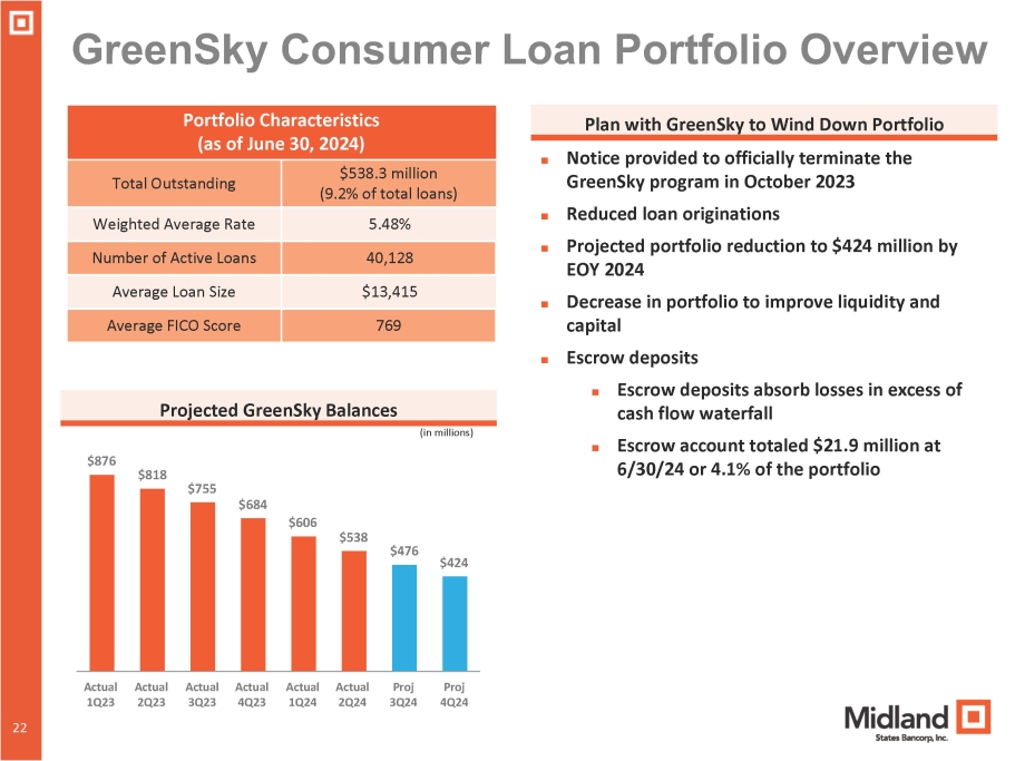 21 Midland Equipment Finance Portfolio Overview 21 Portfolio Characteristics (as of June 30, 2024) Nationwide portfolio providing financing solutions to equipment vendors and end - users $890.1 million (15.2% of total loans) Total Outstanding Loans and Leases 8,204 Number of Loans and Leases $115,791 Average Loan/Lease Size $3.1 million Largest Loan/Lease 6.35% Weighted Average Rate Manufacturing, General Freight Trucking, Construction, Transit and Ground Passenger Representative Industries Served Equipment Finance Outstanding Balances (in millions) $1,115 $1,064 $1,005 $950 $890 2Q23 3Q23 4Q23 1Q24 2Q24 2Q23 3Q23 Note: New production being limited in order to reduce portfolio as a percentage of total loans 0.51% 0.82% 1.55% 1.50% 1.57% 0.59% 1.10% 1.37% 1.77% 2.21% NCOs/Avg Loans & Non Accruals/Qtr end Loans NCOs/Avg Loans NA/Qtr end Loans 4Q23 1Q24 2Q24