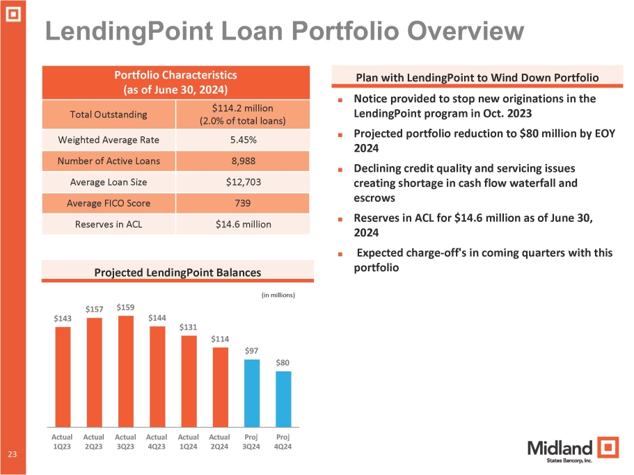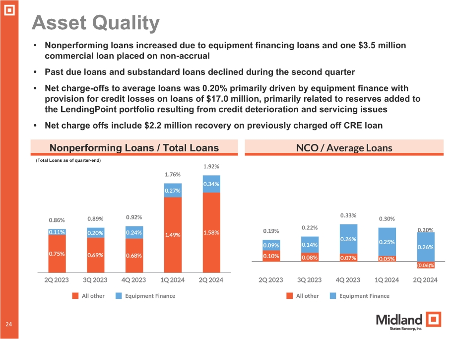 23 LendingPoint Loan Portfolio Overview Portfolio Characteristics (as of June 30, 2024) $114.2 million (2.0% of total loans) Total Outstanding 5.45% Weighted Average Rate 8,988 Number of Active Loans $12,703 Average Loan Size 739 Average FICO Score $14.6 million Reserves in ACL Projected LendingPoint Balances $143 $157 $159 $144 $131 $114 $97 $80 Actual 1Q23 Actual 2Q23 Actual Actual 3Q23 4Q23 Actual Actual Proj Proj 1Q24 2Q24 3Q24 4Q24 Plan with LendingPoint to Wind Down Portfolio ■ Notice provided to stop new originations in the LendingPoint program in Oct. 2023 ■ Projected portfolio reduction to $80 million by EOY 2024 ■ Declining credit quality and servicing issues creating shortage in cash flow waterfall and escrows ■ Reserves in ACL for $14.6 million as of June 30, 2024 ■ Expected charge - off's in coming quarters with this portfolio 23 (in millions)