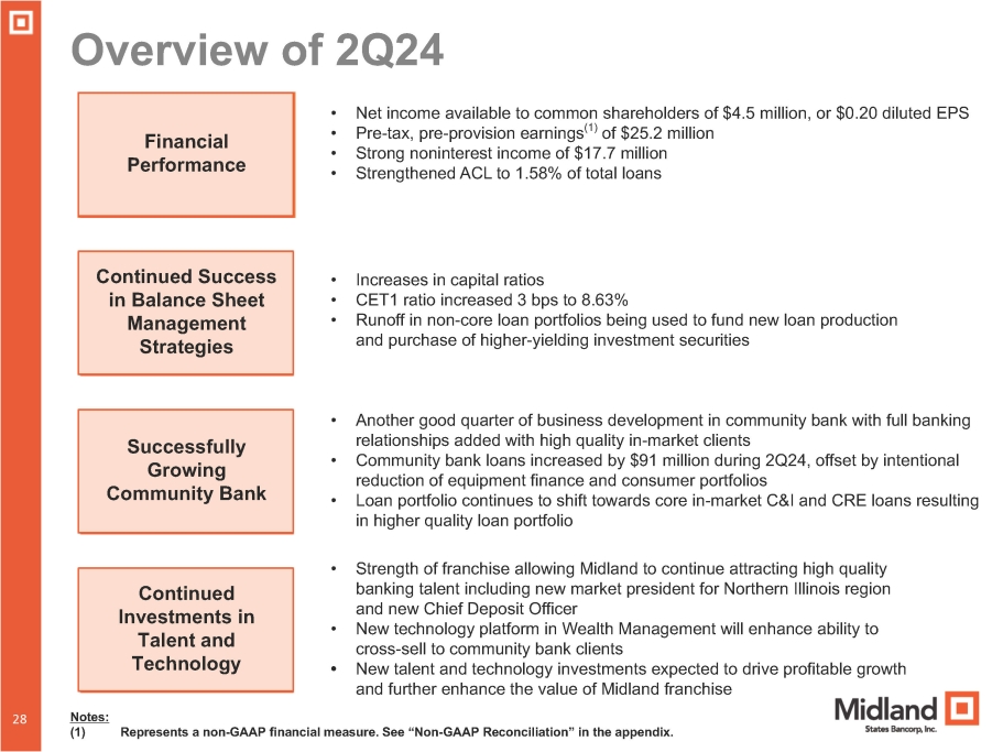 MIDLAND STATES BANCORP, INC. RECONCILIATIONS OF NON - GAAP FINANCIAL MEASURES (unaudited) Adjusted Earnings Reconciliation For the Six Months Ended For The Quarter Ended June 30, 2024 June 30, 2023 June 30, March 31, December 31, September 30, (dollars in thousands, except per share data) 2024 2024 2023 2023 $ 26,669 152 $ 28,820 869 Income before income taxes - GAAP $ 8,429 $ 18,240 $ 27,152 $ 22,935 Adjustments to noninterest income: Loss on sales of investment securities, net 152 — 2,894 4,961 (167) — (676) — (Gain) on repurchase of subordinated debt (167) — — — (Gain) on sale of Visa B shares — — (1,098) — (15) 193 Total adjustments to noninterest income (15) — 1,796 4,961 26,654 29,013 Adjusted earnings pre tax - non - GAAP 8,414 18,240 28,948 27,896 6,030 7,297 Adjusted earnings tax 1,675 4,355 6,927 8,389 20,624 21,716 Adjusted earnings - non - GAAP 6,739 13,885 22,021 19,507 4,456 2,228 Preferred stock dividends 2,228 2,228 2,228 2,229 $ 16,168 $ 19,488 Adjusted earnings available to common shareholders $ 4,511 $ 11,657 $ 19,793 $ 17,278 $ 0.73 $ 0.87 Adjusted diluted earnings per common share $ 0.20 $ 0.53 $ 0.89 $ 0.78 0.53 % 1.10 % Adjusted return on average assets 0.35 % 0.72 % 1.11 % 0.98 % 5.27 % 11.21 % Adjusted return on average shareholders' equity 3.46 % 7.07 % 11.42 % 10.03 % 6.51 % 16.10 % Adjusted return on average tangible common equity 3.65 % 9.34 % 16.51 % 14.24 % Adjusted Pre - Tax, Pre - Provision Earnings Reconciliation For the Six Months Ended For the Quarter Ended June 30, 2024 June 30, 2023 June 30, March 31, December 31, September 30, (dollars in thousands) 2024 2024 2023 2023 $ 26,654 $ 29,013 $ 27,896 $ 28,948 $ 18,240 $ 8,414 Adjusted earnings pre tax - non - GAAP 30,800 5,879 5,168 6,950 14,000 16,800 Provision for credit losses — — — — — — Impairment on commercial mortgage servicing rights $ 57,454 $ 34,892 $ 33,064 $ 35,898 $ 32,240 $ 25,214 Adjusted pre - tax, pre - provision earnings - non - GAAP 1.48 % 1.76 % 1.66 % 1.80 % 1.67 % 1.30 % Adjusted pre - tax, pre - provision return on average assets 50 50
