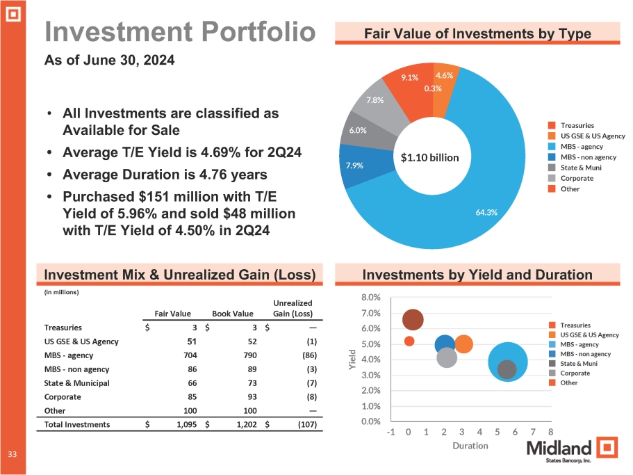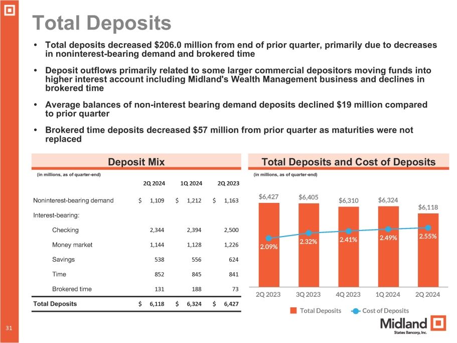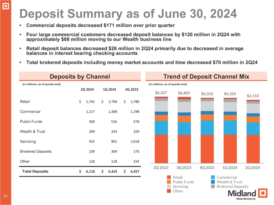 Total Deposits 2,500 2,394 2,344 Checking 1,226 1,128 1,144 Money market 624 556 538 Savings 841 845 852 Time 73 188 131 Brokered time $ 6,427 $ 6,324 Total Deposits $ 6,118 $6,427 $6,405 Noninterest - bearing demand $ 1,109 $ 1,212 $ 1,163 $6,310 $6,324 Interest - bearing: $6,118 2.09% 2.32% 2.41% 2.49% 2.55% 3Q 2023 4Q 2023 Total Deposits Cost of Deposits 2Q 2023 1Q 2024 2Q 2024 • Total deposits decreased $206.0 million from end of prior quarter, primarily due to decreases in noninterest - bearing demand and brokered time • Deposit outflows primarily related to some larger commercial depositors moving funds into higher interest account including Midland's Wealth Management business and declines in brokered time • Average balances of non - interest bearing demand deposits declined $19 million compared to prior quarter • Brokered time deposits decreased $57 million from prior quarter as maturities were not replaced Deposit Mix Total Deposits and Cost of Deposits (in millions, as of quarter - end) (in millions, as of quarter - end) 2Q 2024 1Q 2024 2Q 2023 31 31