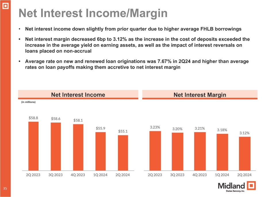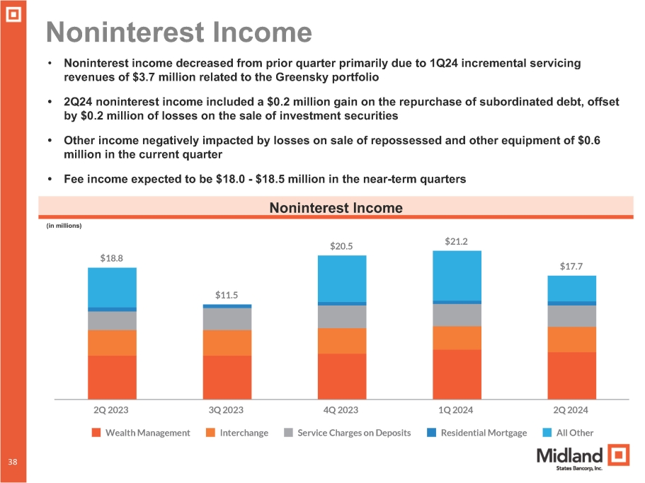 $18.8 $11.5 $20.5 $21.2 $17.7 Wealth Management Interchange Service Charges on Deposits Residential Mortgage All Other 2Q 2023 3Q 2023 4Q 2023 1Q 2024 2Q 2024 Noninterest Income • Noninterest income decreased from prior quarter primarily due to 1Q24 incremental servicing revenues of $3.7 million related to the Greensky portfolio • 2Q24 noninterest income included a $0.2 million gain on the repurchase of subordinated debt, offset by $0.2 million of losses on the sale of investment securities • Other income negatively impacted by losses on sale of repossessed and other equipment of $0.6 million in the current quarter • Fee income expected to be $18.0 - $18.5 million in the near - term quarters Noninterest Income (in millions) 34 38