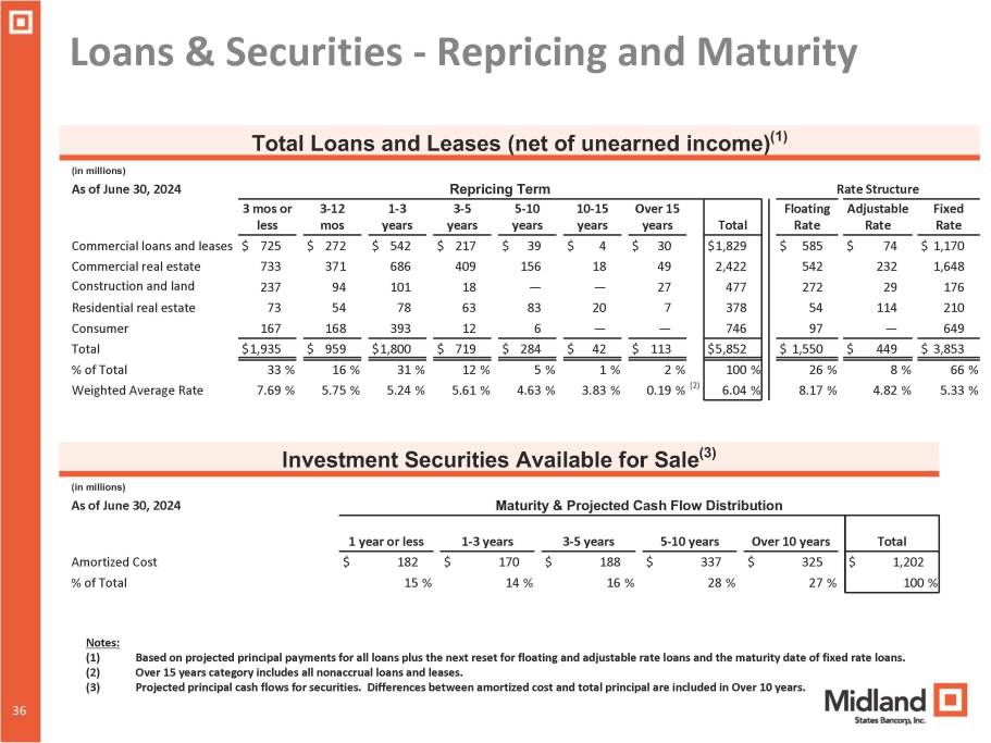 Loans & Securities - Repricing and Maturity Total Over 15 years 10 - 15 years 5 - 10 years 3 - 5 years 1 - 3 years 3 - 12 mos 3 mos or less $1,829 $ 30 $ 4 $ 39 $ 217 $ 542 $ 272 $ 725 2,422 49 18 156 409 686 371 733 477 27 — — 18 101 94 237 378 7 20 83 63 78 54 73 746 — — 6 12 393 168 167 $5,852 $ 959 $1,800 $ 719 $ 284 $ 42 $ 113 $1,935 100 % 2 % 1 % 5 % 12 % 31 % 16 % 33 % 6.04 % (2) 0.19 % 3.83 % 4.63 % 5.61 % 5.24 % 5.75 % 7.69 % Total Loans and Leases (net of unearned income) (1) (in millions) Rate Structure Repricing Term As of June 30, 2024 Fixed Rate Adjustable Rate Floating Rate $ 1,170 $ 74 $ 585 Commercial loans and leases 1,648 232 542 Commercial real estate 176 29 272 Construction and land 210 114 54 Residential real estate 649 — 97 Consumer $ 1,550 $ 449 $ 3,853 Total 66 % 8 % 26 % % of Total 5.33 % 4.82 % 8.17 % Weighted Average Rate Investment Securities Available for Sale (3) (in millions) Maturity & Projected Cash Flow Distribution As of June 30, 2024 Amortized Cost % of Total Total Over 10 years 5 - 10 years 3 - 5 years 1 - 3 years 1 year or less $ 1,202 $ 325 $ 337 $ 188 $ 170 $ 182 100 % 27 % 28 % 16 % 14 % 15 % 34 36 Notes: (1) (2) (3) Based on projected principal payments for all loans plus the next reset for floating and adjustable rate loans and the maturity date of fixed rate loans. Over 15 years category includes all nonaccrual loans and leases. Projected principal cash flows for securities. Differences between amortized cost and total principal are included in Over 10 years.