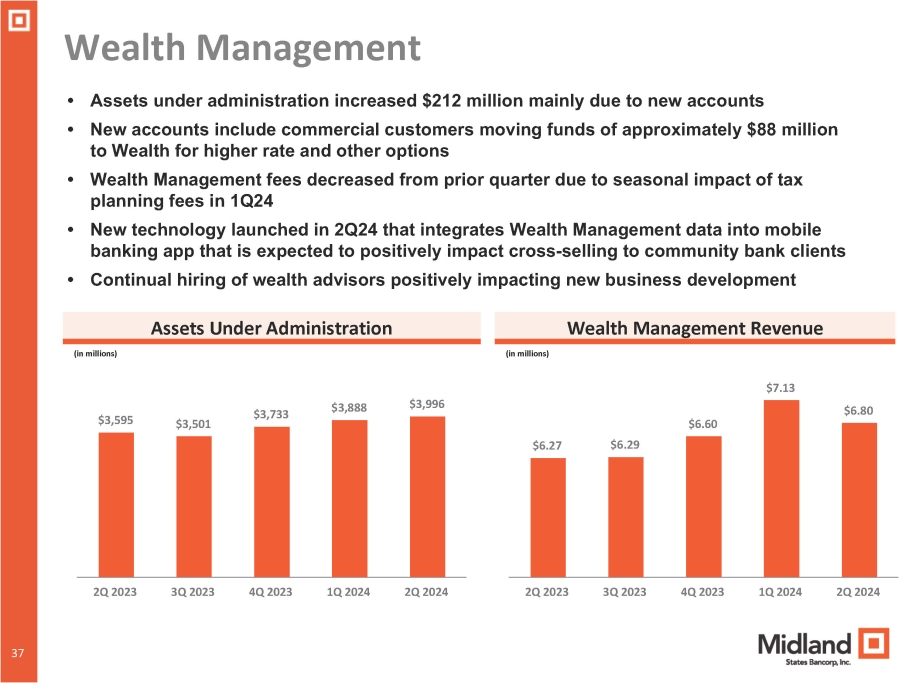 Wealth Management $3,595 $3,501 $3,733 $3,888 $3,996 • Assets under administration increased $212 million mainly due to new accounts • New accounts include commercial customers moving funds of approximately $88 million to Wealth for higher rate and other options • Wealth Management fees decreased from prior quarter due to seasonal impact of tax planning fees in 1Q24 • New technology launched in 2Q24 that integrates Wealth Management data into mobile banking app that is expected to positively impact cross - selling to community bank clients • Continual hiring of wealth advisors positively impacting new business development Assets Under Administration Wealth Management Revenue (in millions) (in millions) $7.13 2Q 2023 3Q 2023 4Q 2023 1Q 2024 2Q 2024 $6.27 34 37 $6.29 $6.60 $6.80 2Q 2023 3Q 2023 4Q 2023 1Q 2024 2Q 2024