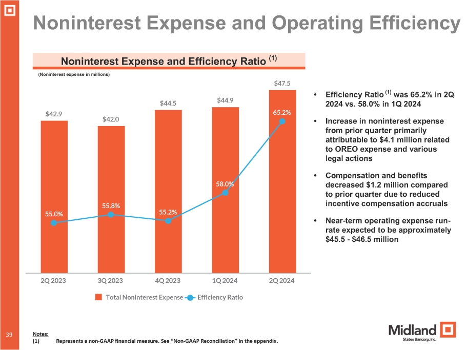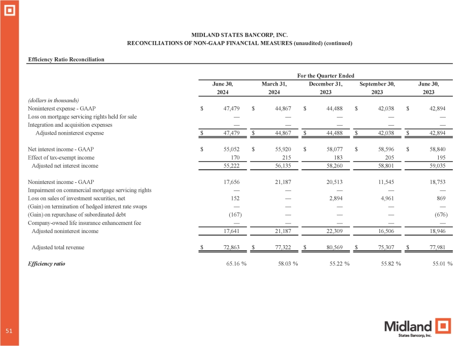 MIDLAND STATES BANCORP, INC. RECONCILIATIONS OF NON - GAAP FINANCIAL MEASURES (unaudited) (continued) Efficiency Ratio Reconciliation For the Quarter Ended June 30, September 30, December 31, March 31, June 30, 2023 2023 2023 2024 2024 $ 42,894 $ 42,038 $ 44,488 $ 44,867 $ 47,479 (dollars in thousands) Noninterest expense - GAAP — — — — — Loss on mortgage servicing rights held for sale — — — — — Integration and acquisition expenses $ 42,894 $ 42,038 $ 44,488 $ 44,867 $ 47,479 Adjusted noninterest expense $ 58,840 $ 58,596 $ 58,077 $ 55,920 $ 55,052 Net interest income - GAAP 195 205 183 215 170 Effect of tax - exempt income 59,035 58,801 58,260 56,135 55,222 Adjusted net interest income 18,753 11,545 20,513 21,187 17,656 Noninterest income - GAAP — — — — — Impairment on commercial mortgage servicing rights 869 4,961 2,894 — 152 Loss on sales of investment securities, net — — — — — (Gain) on termination of hedged interest rate swaps (676) — — — (167) (Gain) on repurchase of subordinated debt — — — — — Company - owned life insurance enhancement fee 18,946 16,506 22,309 21,187 17,641 Adjusted noninterest income $ 77,981 $ 75,307 $ 80,569 $ 77,322 $ 72,863 Adjusted total revenue 55.01 % 55.82 % 55.22 % 58.03 % 65.16 % Efficiency ratio 50 51