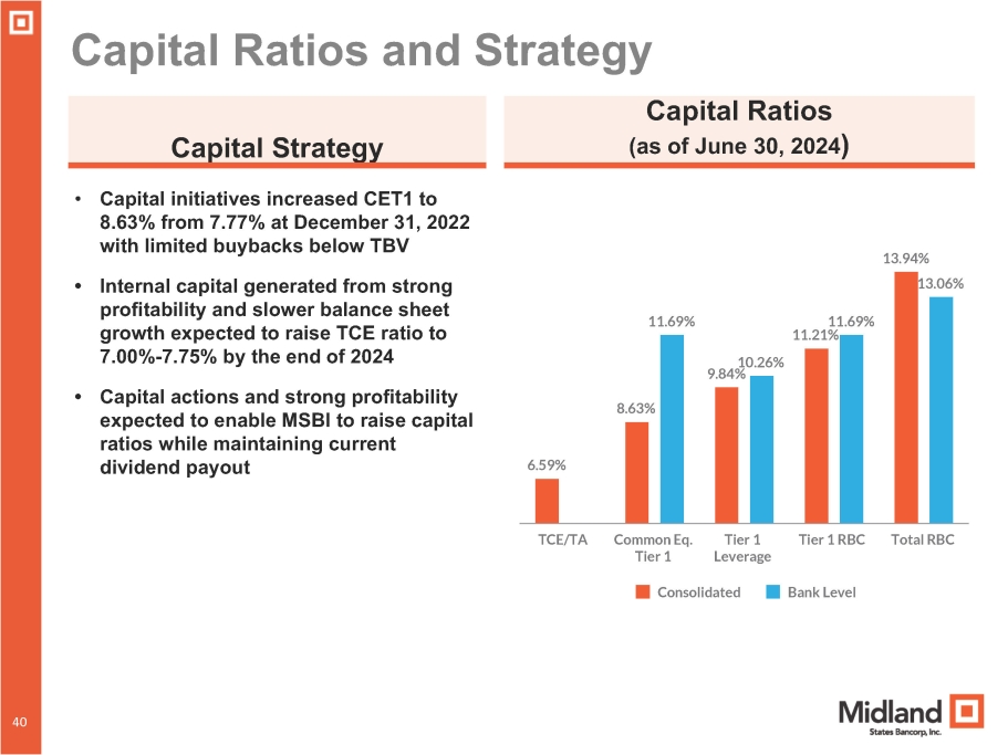 39 $42.9 $42.0 $44.5 $44.9 $47.5 55.0% 55.8% 55.2% 58.0% 65.2% 3Q 2023 4Q 2023 Total Noninterest Expense Efficiency Ratio 2Q 2023 1Q 2024 2Q 2024 Noninterest Expense and Operating Efficiency 39 Noninterest Expense and Efficiency Ratio (1) (Noninterest expense in millions) • Efficiency Ratio (1) was 65.2% in 2Q 2024 vs. 58.0% in 1Q 2024 • Increase in noninterest expense from prior quarter primarily attributable to $4.1 million related to OREO expense and various legal actions • Compensation and benefits decreased $1.2 million compared to prior quarter due to reduced incentive compensation accruals • Near - term operating expense run - rate expected to be approximately $45.5 - $46.5 million Notes: (1) Represents a non - GAAP financial measure. See “Non - GAAP Reconciliation” in the appendix.