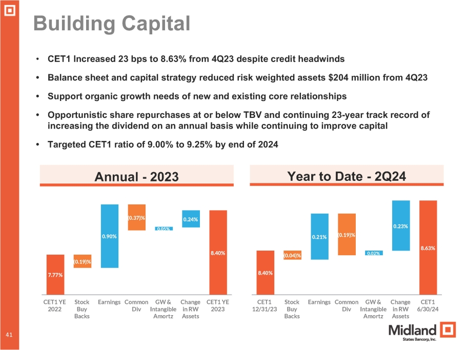 Capital Ratios and Strategy • Capital initiatives increased CET1 to 8.63% from 7.77% at December 31, 2022 with limited buybacks below TBV • Internal capital generated from strong profitability and slower balance sheet growth expected to raise TCE ratio to 7 . 00 % - 7 . 75 % by the end of 2024 • Capital actions and strong profitability expected to enable MSBI to raise capital ratios while maintaining current dividend payout Capital Strategy Capital Ratios (as of June 30, 2024 ) 6.59% 8.63% 9.84% 11.21% 13.94% 11.69% 10.26% 11.69% 13.06% Consolidated Bank Level TCE/TA 40 40 Common Eq. Tier 1 Tier 1 Leverage Tier 1 RBC Total RBC