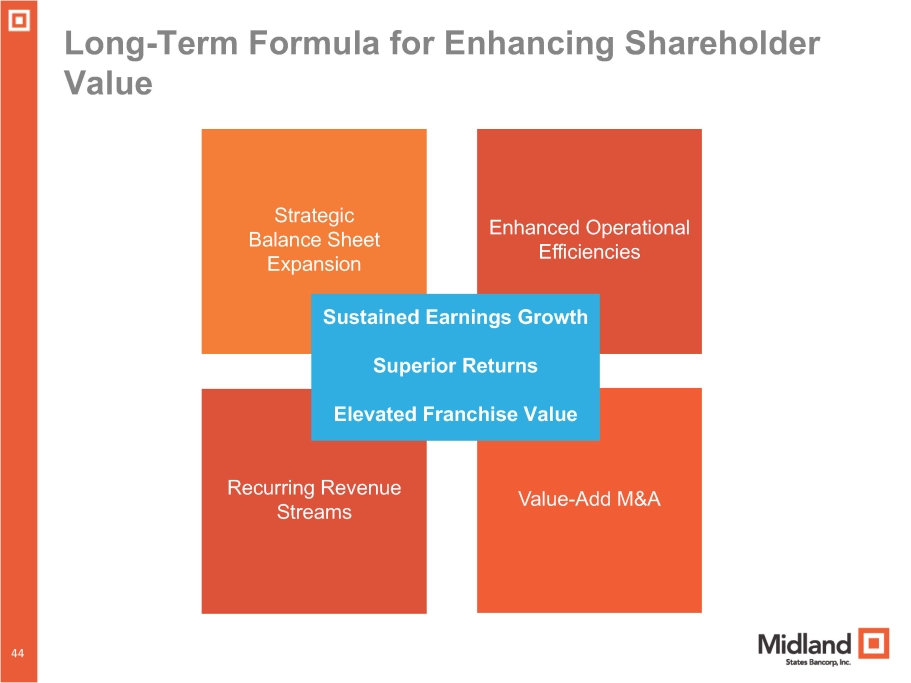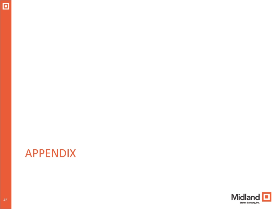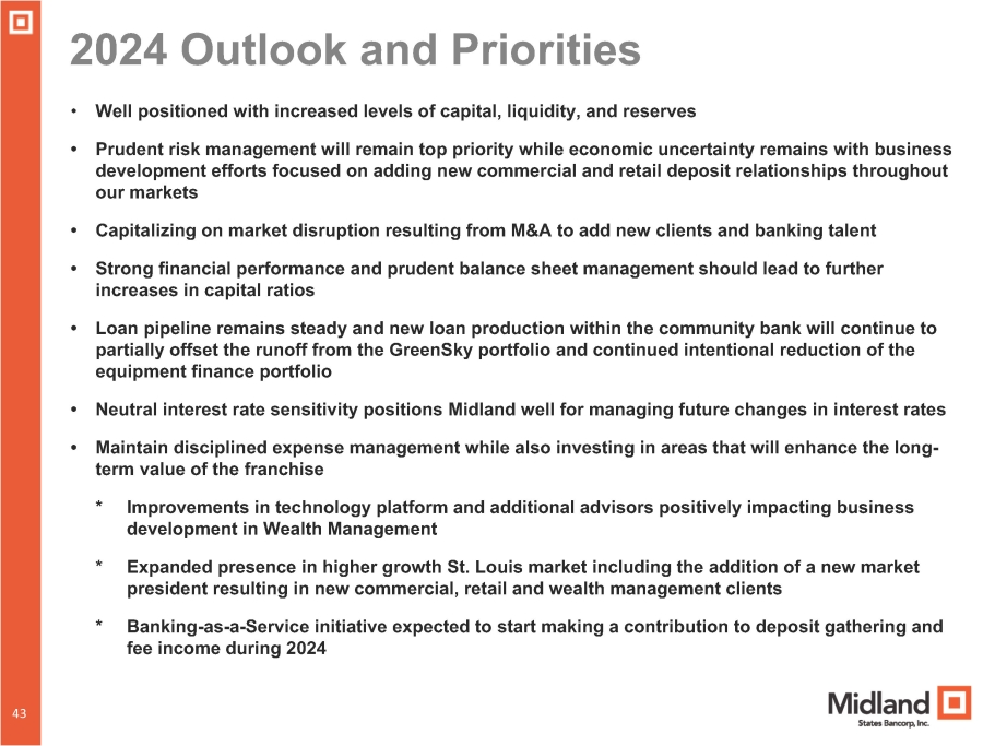 2024 Outlook and Priorities 40 43 • Well positioned with increased levels of capital, liquidity, and reserves • Prudent risk management will remain top priority while economic uncertainty remains with business development efforts focused on adding new commercial and retail deposit relationships throughout our markets • Capitalizing on market disruption resulting from M&A to add new clients and banking talent • Strong financial performance and prudent balance sheet management should lead to further increases in capital ratios • Loan pipeline remains steady and new loan production within the community bank will continue to partially offset the runoff from the GreenSky portfolio and continued intentional reduction of the equipment finance portfolio • Neutral interest rate sensitivity positions Midland well for managing future changes in interest rates • Maintain disciplined expense management while also investing in areas that will enhance the long - term value of the franchise * Improvements in technology platform and additional advisors positively impacting business development in Wealth Management * Expanded presence in higher growth St. Louis market including the addition of a new market president resulting in new commercial, retail and wealth management clients * Banking - as - a - Service initiative expected to start making a contribution to deposit gathering and fee income during 2024