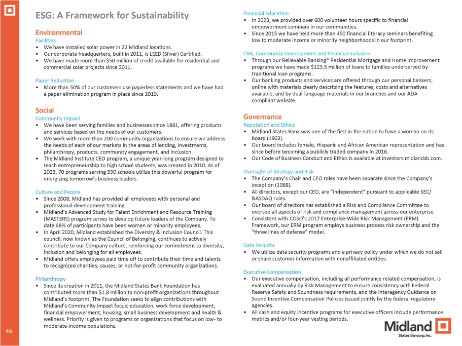 46 ESG: A Framework for Sustainability 46 Environmental Facilities • We have installed solar power in 22 Midland locations. • Our corporate headquarters, built in 2011, is LEED (Silver) Certified. • We have made more than $50 million of credit available for residential and commercial solar projects since 2011. Paper Reduction • More than 50% of our customers use paperless statements and we have had a paper elimination program in place since 2010. Social Community Impact • We have been serving families and businesses since 1881, offering products and services based on the needs of our customers. • We work with more than 200 community organizations to ensure we address the needs of each of our markets in the areas of lending, investments, philanthropy, products, community engagement, and inclusion. • The Midland Institute CEO program, a unique year - long program designed to teach entrepreneurship to high school students, was created in 2010. As of 2023, 70 programs serving 330 schools utilize this powerful program for energizing tomorrow's business leaders. Culture and People • Since 2008, Midland has provided all employees with personal and professional development training. • Midland’s Advanced Study for Talent Enrichment and Resource Training (MASTERS) program serves to develop future leaders of the Company. To date 68% of participants have been women or minority employees. • In April 2020, Midland established the Diversity & Inclusion Council. This council, now known as the Council of Belonging, continues to actively contribute to our Company culture, reinforcing our commitment to diversity, inclusion and belonging for all employees. • Midland offers employees paid time off to contribute their time and talents to recognized charities, causes, or not - for - profit community organizations. Philanthropy • Since its creation in 2011, the Midland States Bank Foundation has contributed more than $1.8 million to non - profit organizations throughout Midland’s footprint. The Foundation seeks to align contributions with Midland’s Community Impact focus: education, work force development, financial empowerment, housing, small business development and health & wellness. Priority is given to programs or organizations that focus on low - to moderate - income populations. Financial Education • In 2023, we provided over 600 volunteer hours specific to financial empowerment seminars in our communities. • Since 2015 we have held more than 450 financial literacy seminars benefiting low to moderate income or minority neighborhoods in our footprint. CRA, Community Development and Financial Inclusion • Through our Believable Banking® Residential Mortgage and Home Improvement programs we have made $123.5 million of loans to families underserved by traditional loan programs. • Our banking products and services are offered through our personal bankers, online with materials clearly describing the features, costs and alternatives available, and by dual - language materials in our branches and our ADA compliant website. Governance Reputation and Ethics • Midland States Bank was one of the first in the nation to have a woman on its board (1903). • Our board includes female, Hispanic and African American representation and has since before becoming a publicly traded company in 2016. • Our Code of Business Conduct and Ethics is available at investors.midlandsb.com. Oversight of Strategy and Risk • The Company’s Chair and CEO roles have been separate since the Company’s inception (1988). • All directors, except our CEO, are “independent” pursuant to applicable SEC/ NASDAQ rules. • Our board of directors has established a Risk and Compliance Committee to oversee all aspects of risk and compliance management across our enterprise. • Consistent with COSO’s 2017 Enterprise - Wide Risk Management (ERM) Framework, our ERM program employs business process risk ownership and the “three lines of defense” model. Data Security • We utilize data security programs and a privacy policy under which we do not sell or share customer information with nonaffiliated entities. Executive Compensation • Our executive compensation, including all performance related compensation, is evaluated annually by Risk Management to ensure consistency with Federal Reserve Safety and Soundness requirements, and the Interagency Guidance on Sound Incentive Compensation Policies issued jointly by the federal regulatory agencies. • All cash and equity incentive programs for executive officers include performance metrics and/or four - year vesting periods.