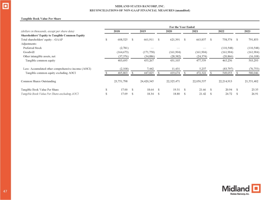 MIDLAND STATES BANCORP, INC. RECONCILIATIONS OF NON - GAAP FINANCIAL MEASURES (unaudited) Tangible Book Value Per Share For the Year Ended 2023 2022 2021 2020 2019 2018 (dollars in thousands, except per share data) $ 791,853 $ 758,574 $ 663,837 $ 621,391 $ 661,911 $ 608,525 Shareholders' Equity to Tangible Common Equity Total shareholders' equity — GAAP (110,548) (110,548) — — — (2,781) Adjustments: Preferred Stock (161,904) (161,904) (161,904) (161,904) (171,758) (164,673) Goodwill (16,108) (20,866) (24,374) (28,382) (34,886) (37,376) Other intangible assets, net 503,293 465,256 477,559 431,105 455,267 403,695 Tangible common equity (76,753) (83,797) 5,237 11,431 7,442 (2,108) Less: Accumulated other comprehensive income (AOCI) $ 580,046 $ 549,053 $ 472,322 $ 419,674 $ 447,825 $ 405,803 Tangible common equity excluding AOCI 21,551,402 22,214,913 22,050,537 22,325,471 24,420,345 23,751,798 Common Shares Outstanding $ 23.35 $ 20.94 $ 21.66 $ 19.31 $ 18.64 $ 17.00 Tangible Book Value Per Share $ 26.91 $ 24.72 $ 21.42 $ 18.80 $ 18.34 $ 17.09 Tangible Book Value Per Share excluding AOCI 47 47