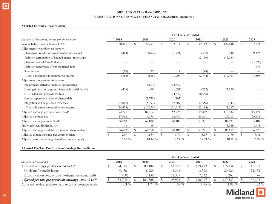 MIDLAND STATES BANCORP, INC. RECONCILIATIONS OF NON - GAAP FINANCIAL MEASURES (unaudited) Adjusted Earnings Reconciliation For The Year Ended 2023 2022 2021 2020 2019 2018 (dollars in thousands, except per share data) $ 107,573 $ 129,838 $ 99,112 $ 32,014 $ 72,471 $ 50,805 Income before income taxes - GAAP Adjustments to noninterest income: 9,372 230 (537) (1,721) (674) (464) (Gain) loss on sales of investment securities, net — (17,531) (2,159) — — — (Gain) on termination of hedged interest rate swaps (1,098) — — — — — (Gain) on sale of Visa B shares (676) — — — — — (Gain) on repurchase of subordinated debt — — (48) 17 29 (89) Other income 7,598 (17,301) (2,744) (1,704) (645) (553) Total adjustments to noninterest income Adjustments to noninterest expense: — — — (12,847) (3,577) — Impairment related to facilities optimization — (3,250) (222) (1,692) 490 (458) (Loss) gain on mortgage servicing rights held for sale — — (8,536) (4,872) — — FHLB advances prepayment fees — — — (193) (1,778) — Loss on repurchase of subordinated debt — (347) (4,356) (2,309) (5,493) (24,015) Integration and acquisition expenses — (3,597) (13,114) (21,913) (10,358) (24,473) Total adjustments to noninterest expense 115,171 116,134 109,482 52,223 82,184 74,725 Adjusted earnings pre tax - non - GAAP 29,682 27,113 26,261 12,040 19,358 17,962 Adjusted earnings tax 85,489 89,021 83,221 40,183 62,826 56,763 Adjusted earnings - non - GAAP 8,913 3,169 — — 46 141 Preferred stock dividends, net $ 76,576 $ 85,852 $ 83,221 $ 40,183 $ 62,780 $ 56,622 Adjusted earnings available to common shareholders $ 3.42 $ 3.79 $ 3.65 $ 1.70 $ 2.54 $ 2.39 Adjusted diluted earnings per common share 15.98 % 18.59 % 18.33 % 9.24 % 14.44 % 15.00 % Adjusted return on average tangible common equity Adjusted Pre - Tax, Pre - Provision Earnings Reconciliation For The Year Ended 2023 2022 2021 2020 2019 2018 (dollars in thousands) $ 115,171 $ 116,134 $ 109,482 $ 52,223 $ 82,184 $ 74,725 Adjusted earnings pre tax - non - GAAP 21,132 20,126 3,393 44,361 16,985 9,430 Provision for credit losses — 1,263 7,532 12,337 2,139 (450) Impairment on commercial mortgage servicing rights $ 136,303 $ 137,523 $ 120,407 $ 108,921 $ 101,308 $ 83,705 Adjusted pre - tax, pre - provision earnings - non - GAAP 1.72 % 1.82 % 1.75 % 1.67 % 1.74 % 1.53 % Adjusted pre - tax, pre - provision return on average assets 47 48