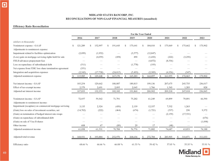 MIDLAND STATES BANCORP, INC. RECONCILIATIONS OF NON - GAAP FINANCIAL MEASURES (unaudited) Efficiency Ratio Reconciliation For the Year Ended 2023 2022 2021 2020 2019 2018 2017 2016 (dollars in thousands) $ 173,902 $ 175,662 $ 175,069 $ 184,010 $ 175,641 $ 191,643 $ 152,997 $ 121,289 Noninterest expense - GAAP Adjustments to noninterest expense: — — — (12,847) (3,577) — (1,952) (2,099) Impairment related to facilities optimization — (3,250) (222) (1,692) 490 (458) (4,059) — (Loss) gain on mortgage servicing rights held for sale — — (8,536) (4,872) — — — — FHLB advances prepayment fees — — — (193) (1,778) — — (511) Loss on repurchase of subordinated debt — — — — — — — (351) Net expense from FDIC loss share termination agreement — (347) (4,356) (2,309) (5,493) (24,015) (17,738) (2,343) Integration and acquisition expenses Adjusted noninterest expense $ 115,985 $ 129,248 $ 167,170 $ 165,283 $ 162,097 $ 161,955 $ 172,065 $ 173,902 236,017 245,735 207,675 199,136 189,815 180,087 129,662 105,254 Net interest income - GAAP 828 1,283 1,543 1,766 2,045 2,095 2,691 2,579 Effect of tax - exempt income 236,845 247,018 209,218 200,902 191,860 182,182 132,353 107,833 Adjusted net interest income 66,590 79,891 69,899 61,249 75,282 71,791 59,362 72,057 Noninterest income - GAAP — 1,263 7,532 12,337 2,139 (450) 2,324 3,135 Adjustments to noninterest income: Impairment (recapture) on commercial mortgage servicing 9,372 230 (537) (1,721) (674) (464) (222) (14,702) (Gain) loss on sales of investment securities, net — (17,531) (2,159) — — — — — (Gain) on termination of hedged interest rate swaps (676) — — — — — — — (Gain) on repurchase of subordinated debt (1,098) — — — — — — — (Gain) on sale of Visa B shares — — (48) 17 29 (89) 67 608 Other income 74,188 63,853 74,687 71,882 76,776 70,788 61,531 61,098 Adjusted noninterest income $ 311,033 $ 310,871 $ 283,905 $ 272,784 $ 268,636 $ 252,970 $ 193,884 $ 168,931 Adjusted total revenue 55.91 % 55.35 % 57.05 % 59.42 % 61.53 % 66.08 % 66.66 % 68.66 % Efficiency ratio 49
