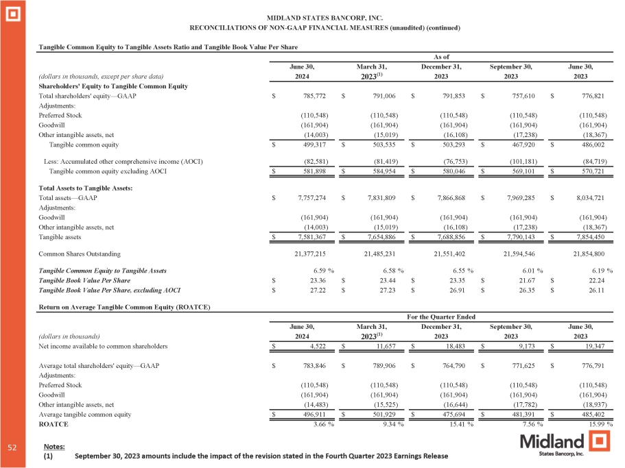 — GAAP Adjustments: (110,548) (110,548) (110,548) (110,548) (110,548) Preferred Stock (161,904) (161,904) (161,904) (161,904) (161,904) Goodwill (18,367) (17,238) (16,108) (15,019) (14,003) Other intangible assets, net $ 486,002 $ 467,920 $ 503,293 $ 503,535 $ 499,317 Tangible common equity (84,719) (101,181) (76,753) (81,419) (82,581) Less: Accumulated other comprehensive income (AOCI) $ 570,721 $ 569,101 $ 580,046 $ 584,954 $ 581,898 Tangible common equity excluding AOCI Total Assets to Tangible Assets: $ 8,034,721 $ 7,969,285 $ 7,866,868 $ 7,831,809 $ 7,757,274 Total assets — GAAP Adjustments: (161,904) (161,904) (161,904) (161,904) (161,904) Goodwill (18,367) (17,238) (16,108) (15,019) (14,003) Other intangible assets, net $ 7,854,450 $ 7,790,143 $ 7,688,856 $ 7,654,886 $ 7,581,367 Tangible assets 21,854,800 21,594,546 21,551,402 21,485,231 21,377,215 Common Shares Outstanding 6.19 % 6.01 % 6.55 % 6.58 % 6.59 % Tangible Common Equity to Tangible Assets $ 22.24 $ 21.67 $ 23.35 $ 23.44 $ 23.36 Tangible Book Value Per Share $ 26.11 $ 26.35 $ 26.91 $ 27.23 $ 27.22 Tangible Book Value Per Share, excluding AOCI Return on Average Tangible Common Equity (ROATCE) For the Quarter Ended June 30, September 30, December 31, March 31, June 30, 2023 2023 2023 2023 (1) 2024 (dollars in thousands) $ 19,347 $ 9,173 $ 18,483 $ 11,657 $ 4,522 Net income available to common shareholders $ 776,791 $ 771,625 $ 764,790 $ 789,906 $ 783,846 Average total shareholders' equity — GAAP Adjustments: (110,548) (110,548) (110,548) (110,548) (110,548) Preferred Stock (161,904) (161,904) (161,904) (161,904) (161,904) Goodwill (18,937) (17,782) (16,644) (15,525) (14,483) Other intangible assets, net $ 485,402 $ 481,391 $ 475,694 $ 501,929 $ 496,911 Average tangible common equity 15.99 % 7.56 % 15.41 % 9.34 % 3.66 % ROATCE MIDLAND STATES BANCORP, INC. RECONCILIATIONS OF NON - GAAP FINANCIAL MEASURES (unaudited) (continued) (1) September 30, 2023 amounts include the impact of the revision stated in the Fourth Quarter 2023 Earnings Release
