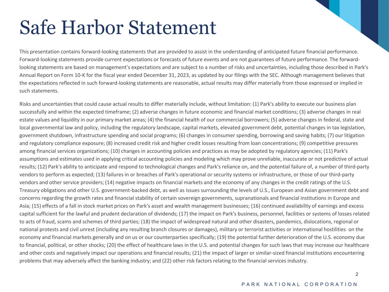 Safe Harbor Statement P A R K N A T I O N A L C O R P O R A T I O N 2 This presentation contains forward-looking statements that are provided to assist in the understanding of anticipated future financial performance. Forward-looking statements provide current expectations or forecasts of future events and are not guarantees of future performance. The forward- looking statements are based on management’s expectations and are subject to a number of risks and uncertainties, including those described in Park's Annual Report on Form 10-K for the fiscal year ended December 31, 2023, as updated by our filings with the SEC. Although management believes that the expectations reflected in such forward-looking statements are reasonable, actual results may differ materially from those expressed or implied in such statements. Risks and uncertainties that could cause actual results to differ materially include, without limitation: (1) Park's ability to execute our business plan successfully and within the expected timeframe; (2) adverse changes in future economic and financial market conditions; (3) adverse changes in real estate values and liquidity in our primary market areas; (4) the financial health of our commercial borrowers; (5) adverse changes in federal, state and local governmental law and policy, including the regulatory landscape, capital markets, elevated government debt, potential changes in tax legislation, government shutdown, infrastructure spending and social programs; (6) changes in consumer spending, borrowing and saving habits; (7) our litigation and regulatory compliance exposure; (8) increased credit risk and higher credit losses resulting from loan concentrations; (9) competitive pressures among financial services organizations; (10) changes in accounting policies and practices as may be adopted by regulatory agencies; (11) Park's assumptions and estimates used in applying critical accounting policies and modeling which may prove unreliable, inaccurate or not predictive of actual results; (12) Park's ability to anticipate and respond to technological changes and Park's reliance on, and the potential failure of, a number of third-party vendors to perform as expected; (13) failures in or breaches of Park's operational or security systems or infrastructure, or those of our third-party vendors and other service providers; (14) negative impacts on financial markets and the economy of any changes in the credit ratings of the U.S. Treasury obligations and other U.S. government-backed debt, as well as issues surrounding the levels of U.S., European and Asian government debt and concerns regarding the growth rates and financial stability of certain sovereign governments, supranationals and financial institutions in Europe and Asia; (15) effects of a fall in stock market prices on Park's asset and wealth management businesses; (16) continued availability of earnings and excess capital sufficient for the lawful and prudent declaration of dividends; (17) the impact on Park's business, personnel, facilities or systems of losses related to acts of fraud, scams and schemes of third parties; (18) the impact of widespread natural and other disasters, pandemics, dislocations, regional or national protests and civil unrest (including any resulting branch closures or damages), military or terrorist activities or international hostilities on the economy and financial markets generally and on us or our counterparties specifically; (19) the potential further deterioration of the U.S. economy due to financial, political, or other shocks; (20) the effect of healthcare laws in the U.S. and potential changes for such laws that may increase our healthcare and other costs and negatively impact our operations and financial results; (21) the impact of larger or similar-sized financial institutions encountering problems that may adversely affect the banking industry; and (22) other risk factors relating to the financial services industry.