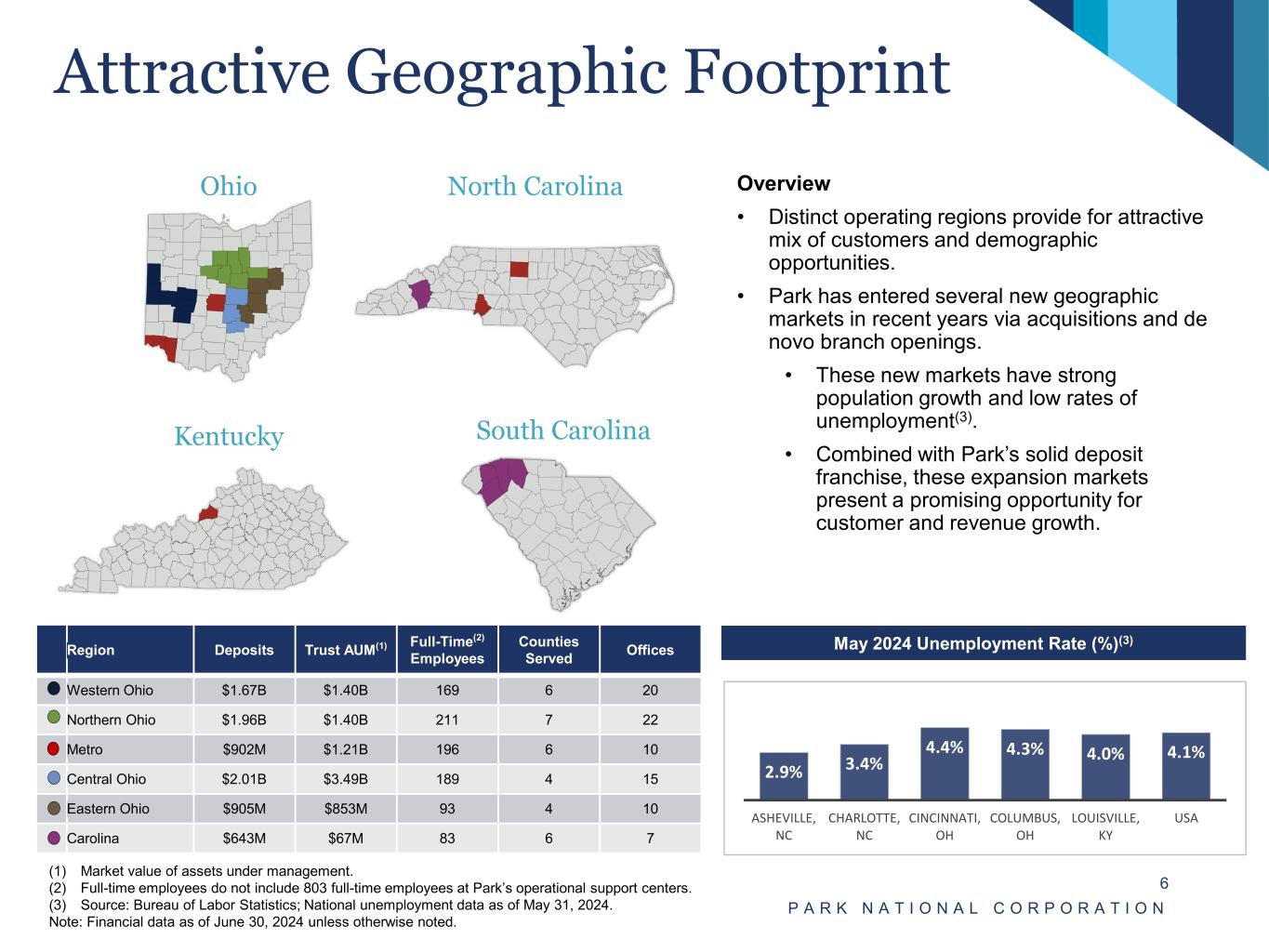 Overview of Park National Corporation P A R K N A T I O N A L C O R P O R A T I O N 5 • Park’s bank subsidiary, The Park National Bank, is headquartered in Newark, Ohio and was founded in 1908. • $9.9 billion of total assets and $8.4 billion of assets under management(1) at June 30, 2024. • Park common shares are publicly traded under the symbol “PRK” on NYSE American. • Diversified revenue base with approximately 22.1% non- interest income to operating revenue(5) ratio for the six months ended June 30, 2024. • Diversified loan portfolio funded with customer deposits. • Below average historical net charge-offs relative to Proxy Peer Group. • Low-cost funding profile supports durable net interest margin and extended trend of stable operating results. • At June 30, 2023, Park’s average deposit market share was approximately 35% in Park’s six largest county markets in Ohio. (1) Market value of assets under management. (2) See “Reconciliation of Non-GAAP Financial Measures” shown on pages 35 and 36. (3) NPAs exclude accruing troubled debt restructuring loans and loans 90+ days past due. (4) Net interest margin shown on a fully taxable equivalent basis assuming a 21% corporate federal income tax rate. (5) Definitions: TE – Tangible Equity; TA – Tangible Assets; ACL – Allowance for Credit Losses; NPA – Non-Performing Assets, ROAA – Return on Average Assets; ROATE – Return on Average Tangible Equity; Operating Revenue = Non-Interest Income + Net Interest Income (6) For the purpose of calculating the annualized return on average tangible equity, a non-U.S. GAAP financial measure, net income for each period is divided by average tangible equity during the period. (7) Ratios presented YTD through June 30, 2024 are shown on an annualized basis. Note: Financial data as of June 30, 2024 unless otherwise noted; Source: S&P Global Market Intelligence. Company Overview $ in millions 12/31/2022 12/31/2023 6/30/2024 Total Assets 9,855$ 9,837$ 9,920$ Total Loans (Gross) 7,142 7,476 7,664 Total Deposits 8,235 8,043 8,313 Total Shareholders' Equity 1,069 1,145 1,183 Total Equity / Total Assets 10.85% 11.64% 11.93% TE / TA (2) (5) 9.33% 10.14% 10.45% ACL / Loans (5) 1.20% 1.12% 1.13% NPAs / Total Assets (3) (5) 0.82% 0.62% 0.73% Net Interest Margin (4) (7) 3.80% 4.11% 4.33% ROAA (5) (7) 1.48% 1.27% 1.52% Return on Average Equity (7) 13.78% 11.55% 12.88% ROATE (2) (5) (6) (7) 16.29% 13.60% 14.98% At or Year to Date