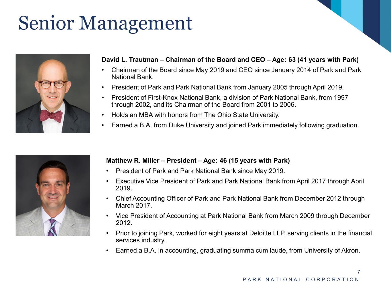 Attractive Geographic Footprint P A R K N A T I O N A L C O R P O R A T I O N 6 Ohio North Carolina South CarolinaKentucky Region Deposits Trust AUM(1) Full-Time(2) Employees Counties Served Offices Western Ohio $1.67B $1.40B 169 6 20 Northern Ohio $1.96B $1.40B 211 7 22 Metro $902M $1.21B 196 6 10 Central Ohio $2.01B $3.49B 189 4 15 Eastern Ohio $905M $853M 93 4 10 Carolina $643M $67M 83 6 7 Overview • Distinct operating regions provide for attractive mix of customers and demographic opportunities. • Park has entered several new geographic markets in recent years via acquisitions and de novo branch openings. • These new markets have strong population growth and low rates of unemployment(3). • Combined with Park’s solid deposit franchise, these expansion markets present a promising opportunity for customer and revenue growth. May 2024 Unemployment Rate (%)(3) (1) Market value of assets under management. (2) Full-time employees do not include 803 full-time employees at Park’s operational support centers. (3) Source: Bureau of Labor Statistics; National unemployment data as of May 31, 2024. Note: Financial data as of June 30, 2024 unless otherwise noted. 2.9% 3.4% 4.4% 4.3% 4.0% 4.1% ASHEVILLE, NC CHARLOTTE, NC CINCINNATI, OH COLUMBUS, OH LOUISVILLE, KY USA