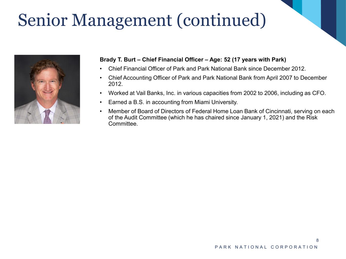 Senior Management P A R K N A T I O N A L C O R P O R A T I O N 7 David L. Trautman – Chairman of the Board and CEO – Age: 63 (41 years with Park) • Chairman of the Board since May 2019 and CEO since January 2014 of Park and Park National Bank. • President of Park and Park National Bank from January 2005 through April 2019. • President of First-Knox National Bank, a division of Park National Bank, from 1997 through 2002, and its Chairman of the Board from 2001 to 2006. • Holds an MBA with honors from The Ohio State University. • Earned a B.A. from Duke University and joined Park immediately following graduation. Matthew R. Miller – President – Age: 46 (15 years with Park) • President of Park and Park National Bank since May 2019. • Executive Vice President of Park and Park National Bank from April 2017 through April 2019. • Chief Accounting Officer of Park and Park National Bank from December 2012 through March 2017. • Vice President of Accounting at Park National Bank from March 2009 through December 2012. • Prior to joining Park, worked for eight years at Deloitte LLP, serving clients in the financial services industry. • Earned a B.A. in accounting, graduating summa cum laude, from University of Akron.