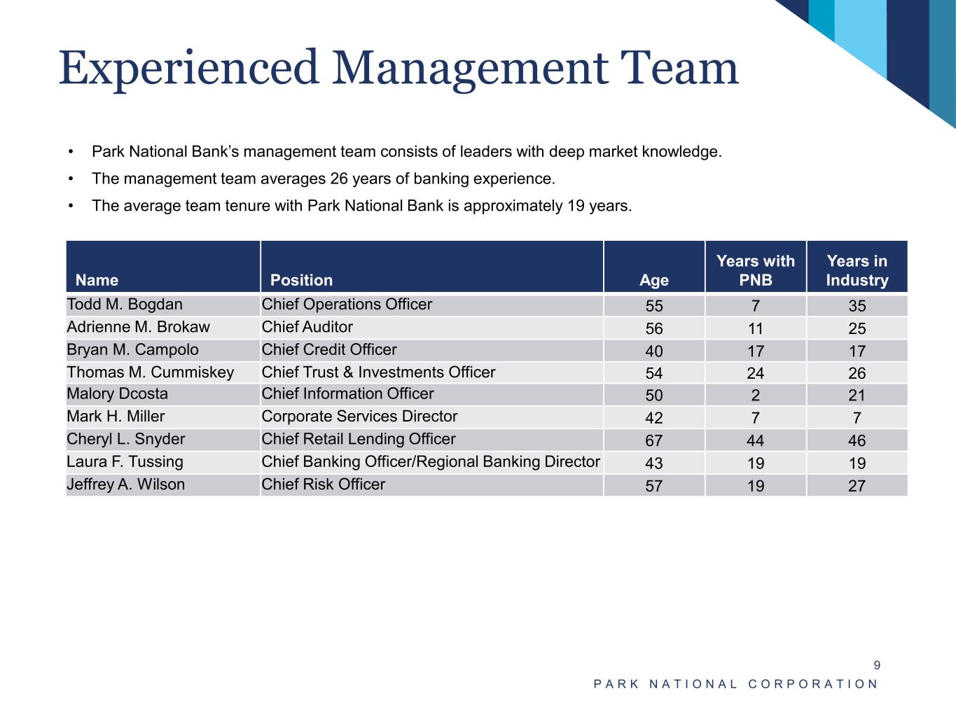 Senior Management (continued) P A R K N A T I O N A L C O R P O R A T I O N 8 Brady T. Burt – Chief Financial Officer – Age: 52 (17 years with Park) • Chief Financial Officer of Park and Park National Bank since December 2012. • Chief Accounting Officer of Park and Park National Bank from April 2007 to December 2012. • Worked at Vail Banks, Inc. in various capacities from 2002 to 2006, including as CFO. • Earned a B.S. in accounting from Miami University. • Member of Board of Directors of Federal Home Loan Bank of Cincinnati, serving on each of the Audit Committee (which he has chaired since January 1, 2021) and the Risk Committee.