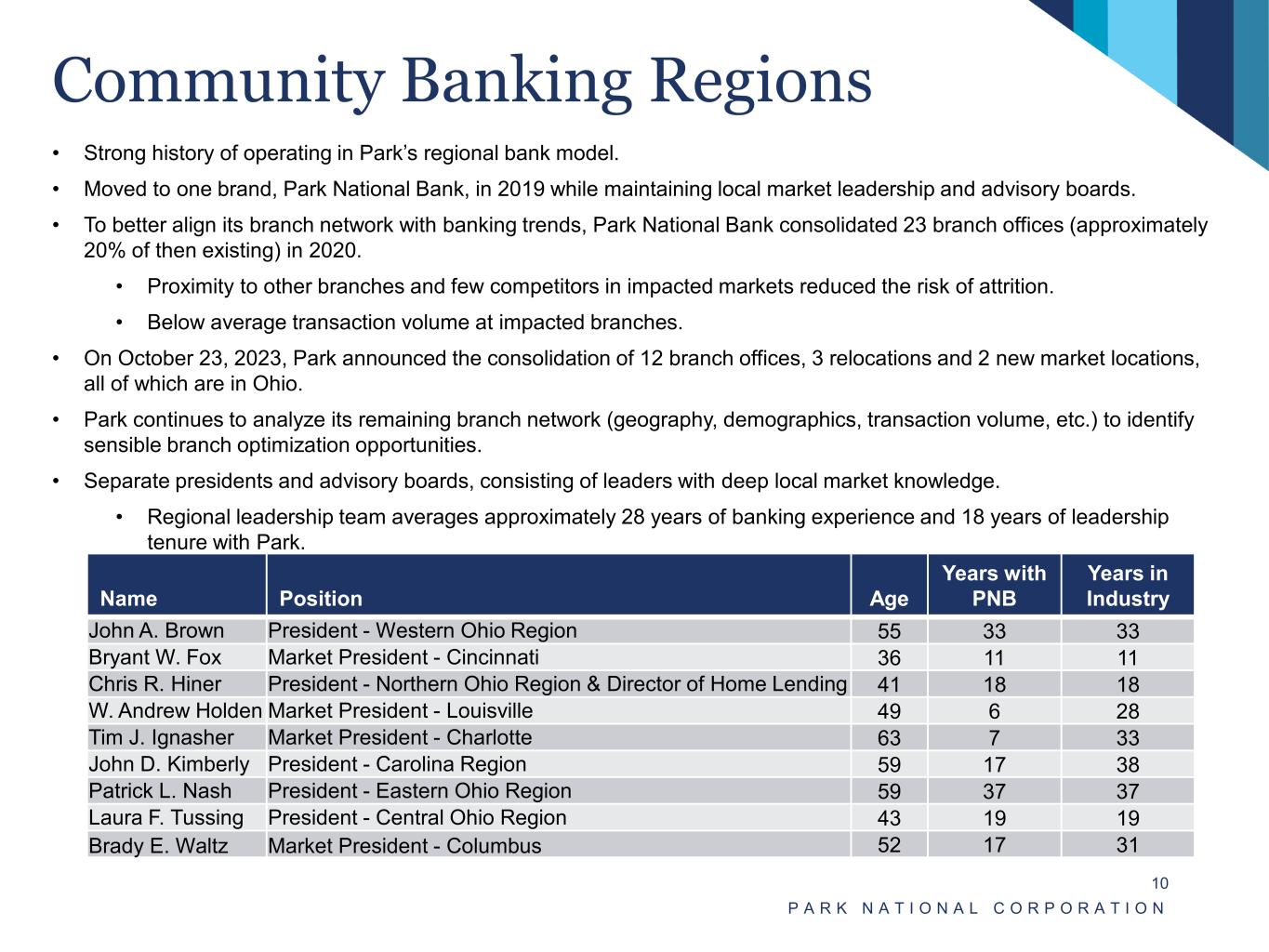 • Strong history of operating in Park’s regional bank model. • Moved to one brand, Park National Bank, in 2019 while maintaining local market leadership and advisory boards. • To better align its branch network with banking trends, Park National Bank consolidated 23 branch offices (approximately 20% of then existing) in 2020. • Proximity to other branches and few competitors in impacted markets reduced the risk of attrition. • Below average transaction volume at impacted branches. • On October 23, 2023, Park announced the consolidation of 12 branch offices, 3 relocations and 2 new market locations, all of which are in Ohio. • Park continues to analyze its remaining branch network (geography, demographics, transaction volume, etc.) to identify sensible branch optimization opportunities. • Separate presidents and advisory boards, consisting of leaders with deep local market knowledge. • Regional leadership team averages approximately 28 years of banking experience and 18 years of leadership tenure with Park. P A R K N A T I O N A L C O R P O R A T I O N 10 Community Banking Regions Name Position Age Years with PNB Years in Industry John A. Brown President - Western Ohio Region 55 33 33 Bryant W. Fox Market President - Cincinnati 36 11 11 Chris R. Hiner President - Northern Ohio Region & Director of Home Lending 41 18 18 W. Andrew Holden Market President - Louisville 49 6 28 Tim J. Ignasher Market President - Charlotte 63 7 33 John D. Kimberly President - Carolina Region 59 17 38 Patrick L. Nash President - Eastern Ohio Region 59 37 37 Laura F. Tussing President - Central Ohio Region 43 19 19 Brady E. Waltz Market President - Columbus 52 17 31