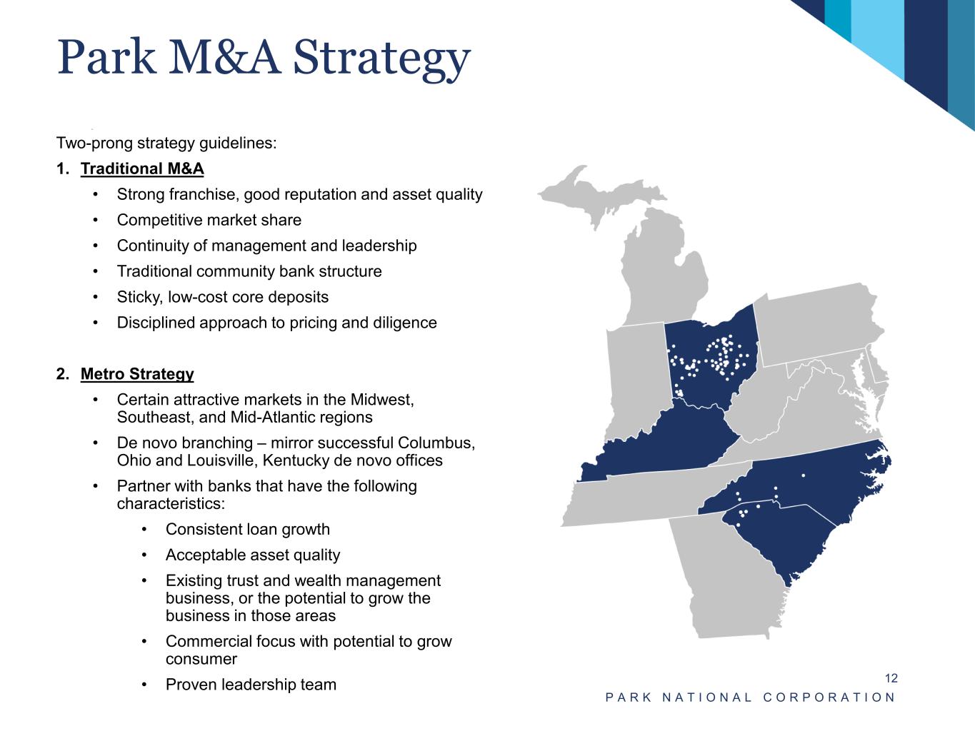 Preparation to Cross $10 Billion in Assets • Since Q3 2020, Park has been strategically managing the balance sheet size to stay under $10 billion in assets(1) using one-way sell deposits and other balance sheet strategies. • In Q3 2022, Park engaged Promontory (third-party professional services firm) to assess Park’s preparedness as it relates to regulatory expectations that typically present themselves when banks cross $10 billion in assets. • From Q3 2022 to present, Park continues to invest in people, processes and technology to better prepare for the enhanced regulatory expectations. • Park believes that it is very well positioned for the regulatory expectations in the event assets grow over $10 billion, whether by acquisition, merger or organically. P A R K N A T I O N A L C O R P O R A T I O N 11 (1) Park crossed $10 billion in assets two times since then, once on September 30, 2021, and again on September 30, 2023.