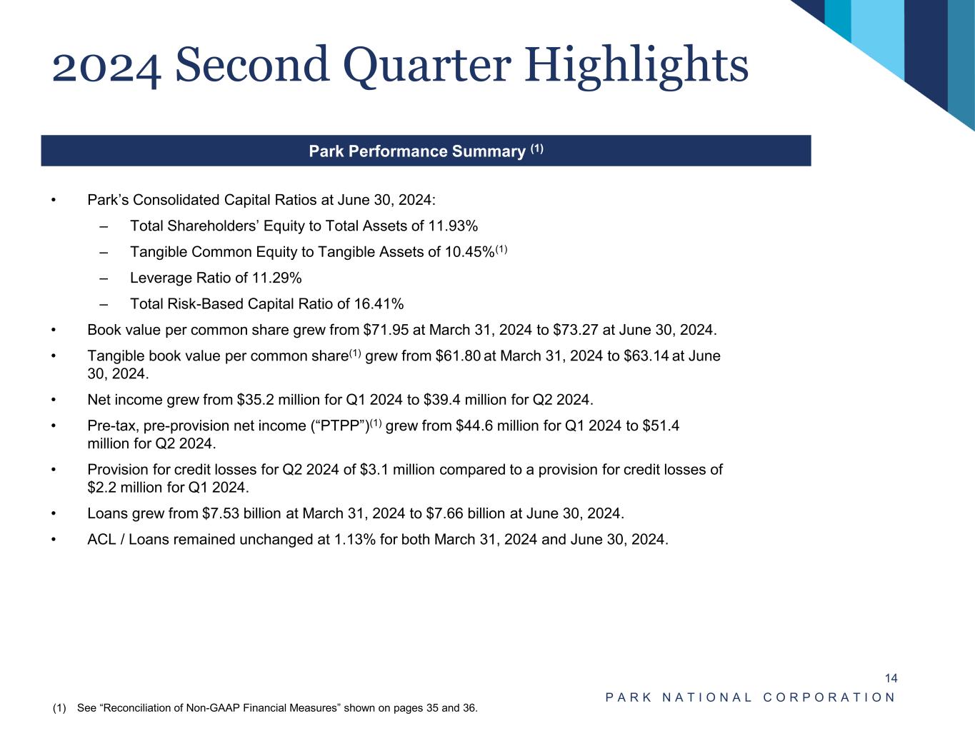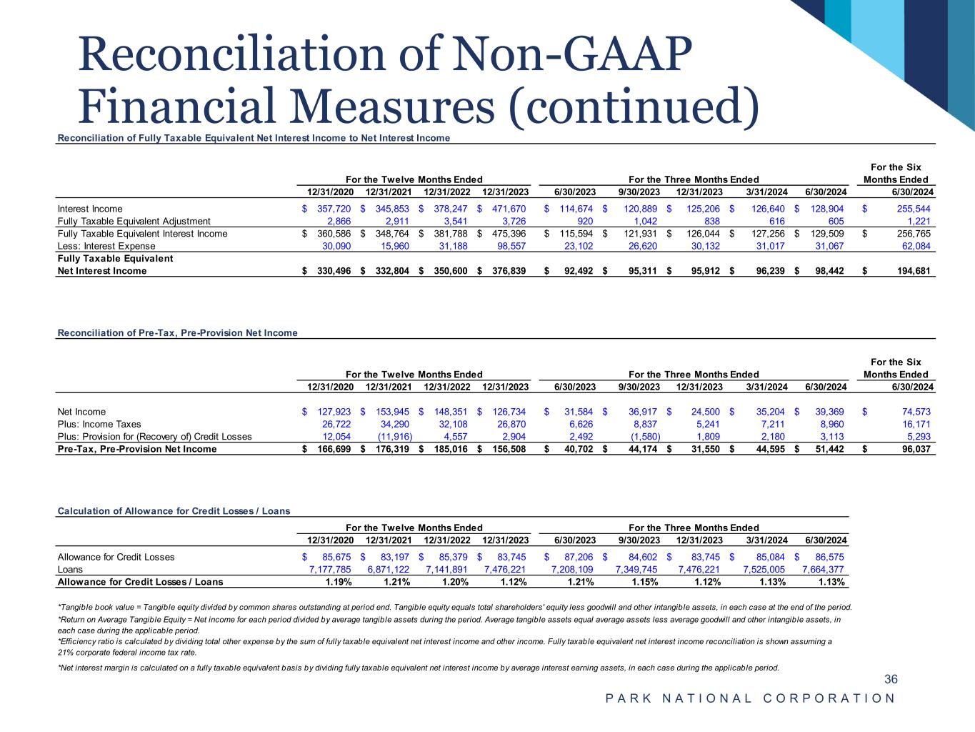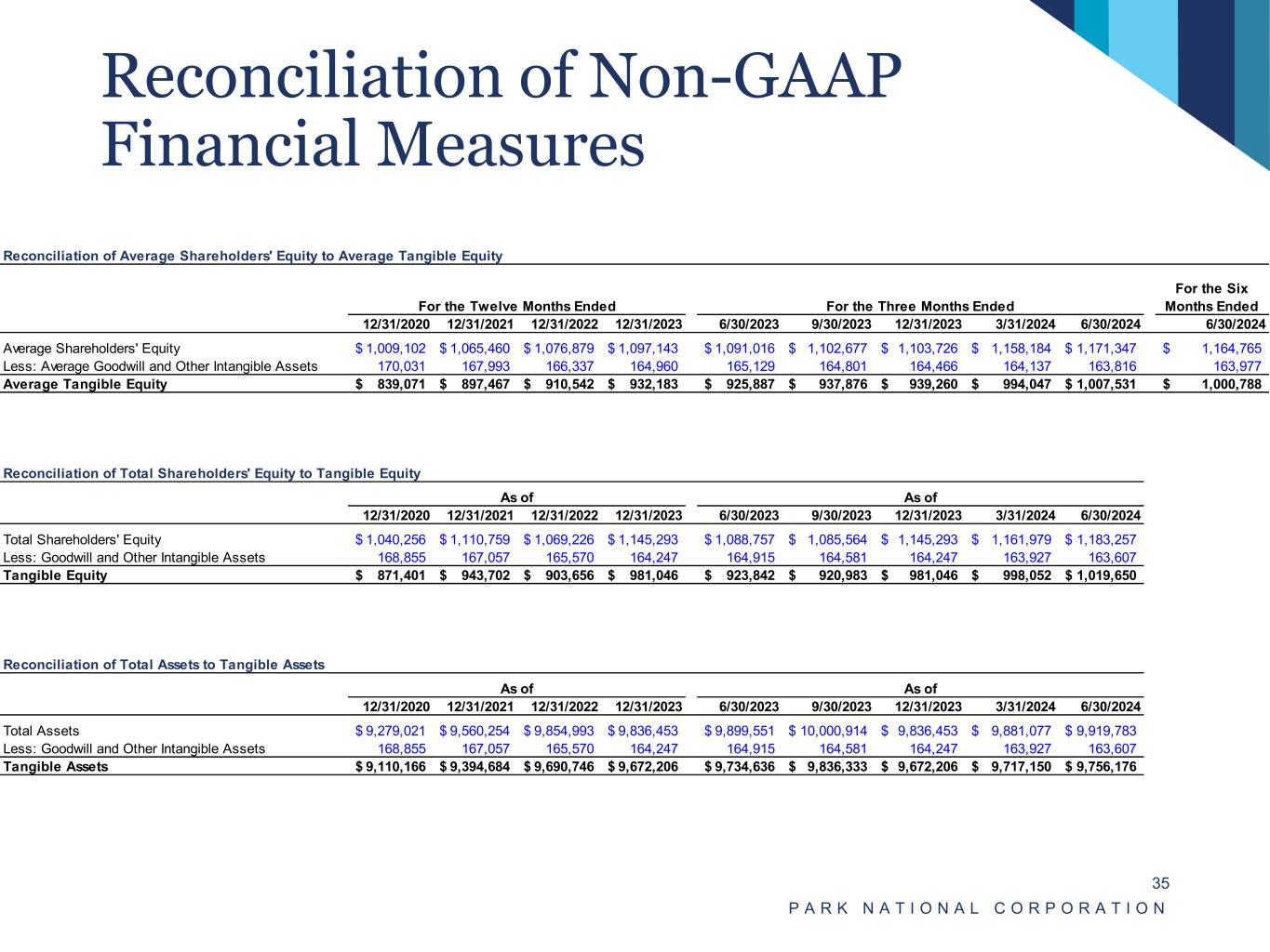 Reconciliation of Non-GAAP Financial Measures P A R K N A T I O N A L C O R P O R A T I O N 35 Reconciliation of Average Shareholders' Equity to Average Tangible Equity For the Twelve Months Ended For the Three Months Ended For the Six Months Ended 12/31/2020 12/31/2021 12/31/2022 12/31/2023 6/30/2023 9/30/2023 12/31/2023 3/31/2024 6/30/2024 6/30/2024 Average Shareholders' Equity 1,009,102$ 1,065,460$ 1,076,879$ 1,097,143$ 1,091,016$ 1,102,677$ 1,103,726$ 1,158,184$ 1,171,347$ 1,164,765$ Less: Average Goodwill and Other Intangible Assets 170,031 167,993 166,337 164,960 165,129 164,801 164,466 164,137 163,816 163,977 Average Tangible Equity 839,071$ 897,467$ 910,542$ 932,183$ 925,887$ 937,876$ 939,260$ 994,047$ 1,007,531$ 1,000,788$ Reconciliation of Total Shareholders' Equity to Tangible Equity As of As of 12/31/2020 12/31/2021 12/31/2022 12/31/2023 6/30/2023 9/30/2023 12/31/2023 3/31/2024 6/30/2024 Total Shareholders' Equity 1,040,256$ 1,110,759$ 1,069,226$ 1,145,293$ 1,088,757$ 1,085,564$ 1,145,293$ 1,161,979$ 1,183,257$ Less: Goodwill and Other Intangible Assets 168,855 167,057 165,570 164,247 164,915 164,581 164,247 163,927 163,607 Tangible Equity 871,401$ 943,702$ 903,656$ 981,046$ 923,842$ 920,983$ 981,046$ 998,052$ 1,019,650$ Reconciliation of Total Assets to Tangible Assets As of As of 12/31/2020 12/31/2021 12/31/2022 12/31/2023 6/30/2023 9/30/2023 12/31/2023 3/31/2024 6/30/2024 Total Assets 9,279,021$ 9,560,254$ 9,854,993$ 9,836,453$ 9,899,551$ 10,000,914$ 9,836,453$ 9,881,077$ 9,919,783$ Less: Goodwill and Other Intangible Assets 168,855 167,057 165,570 164,247 164,915 164,581 164,247 163,927 163,607 Tangible Assets 9,110,166$ 9,394,684$ 9,690,746$ 9,672,206$ 9,734,636$ 9,836,333$ 9,672,206$ 9,717,150$ 9,756,176$