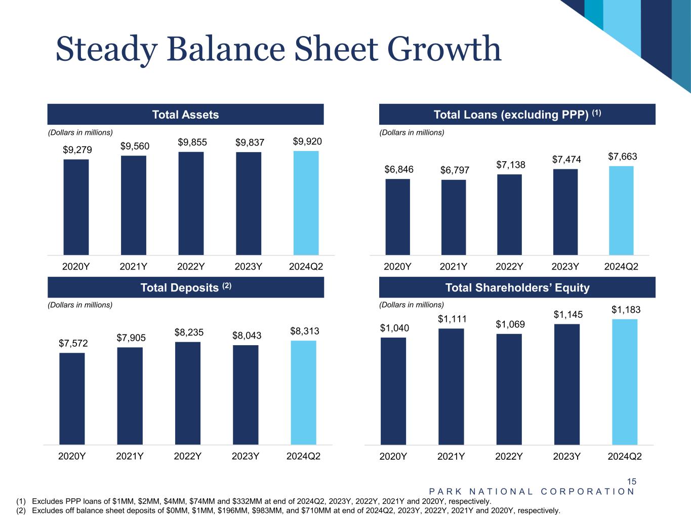 2024 Second Quarter Highlights P A R K N A T I O N A L C O R P O R A T I O N 14 • Park’s Consolidated Capital Ratios at June 30, 2024: – Total Shareholders’ Equity to Total Assets of 11.93% – Tangible Common Equity to Tangible Assets of 10.45%(1) – Leverage Ratio of 11.29% – Total Risk-Based Capital Ratio of 16.41% • Book value per common share grew from $71.95 at March 31, 2024 to $73.27 at June 30, 2024. • Tangible book value per common share(1) grew from $61.80 at March 31, 2024 to $63.14 at June 30, 2024. • Net income grew from $35.2 million for Q1 2024 to $39.4 million for Q2 2024. • Pre-tax, pre-provision net income (“PTPP”)(1) grew from $44.6 million for Q1 2024 to $51.4 million for Q2 2024. • Provision for credit losses for Q2 2024 of $3.1 million compared to a provision for credit losses of $2.2 million for Q1 2024. • Loans grew from $7.53 billion at March 31, 2024 to $7.66 billion at June 30, 2024. • ACL / Loans remained unchanged at 1.13% for both March 31, 2024 and June 30, 2024. Park Performance Summary (1) (1) See “Reconciliation of Non-GAAP Financial Measures” shown on pages 35 and 36.