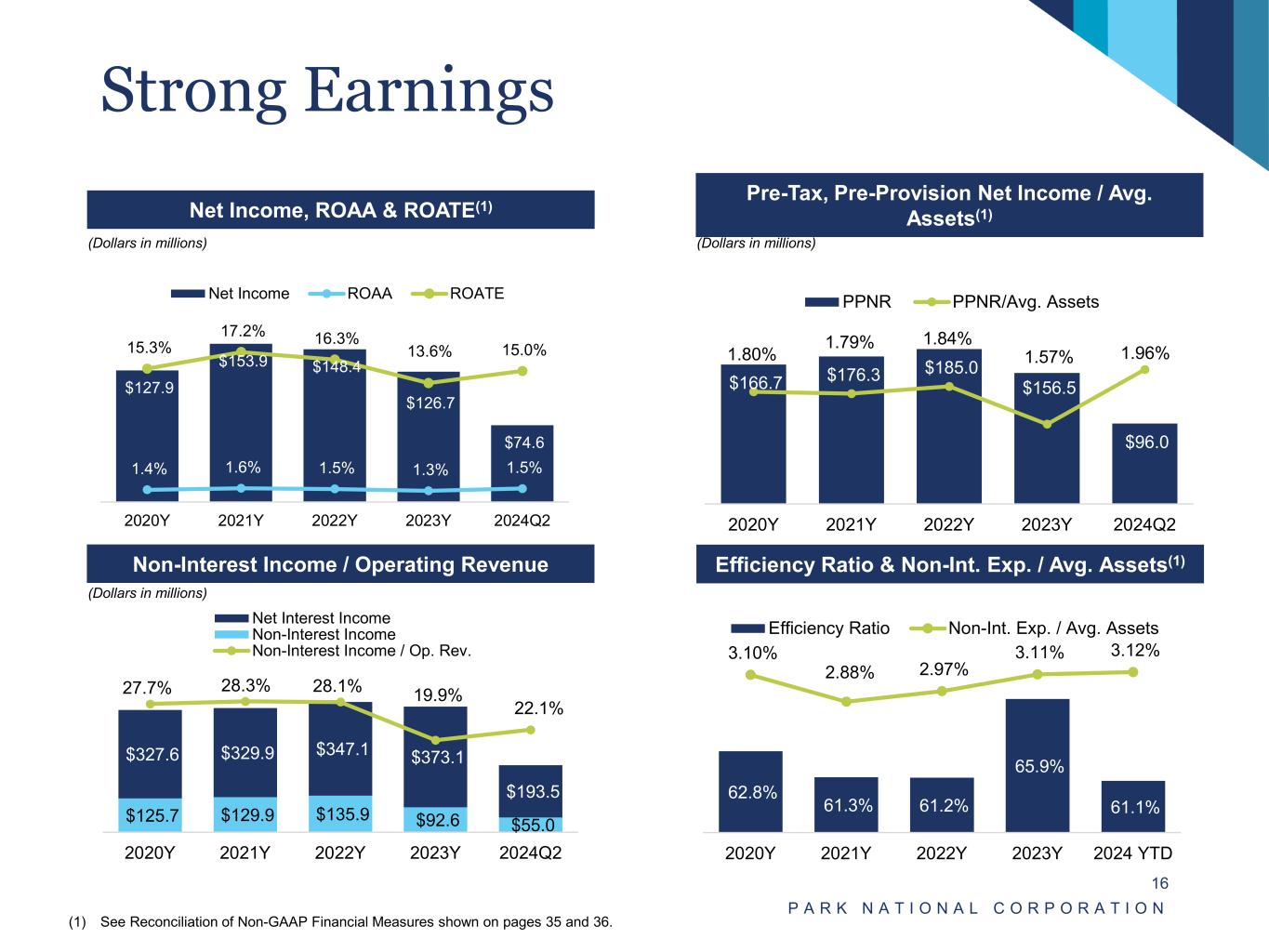 Steady Balance Sheet Growth P A R K N A T I O N A L C O R P O R A T I O N 15 Total Assets Total Loans (excluding PPP) (1) Total Deposits (2) Total Shareholders’ Equity (Dollars in millions) (Dollars in millions) (Dollars in millions) (Dollars in millions) (1) Excludes PPP loans of $1MM, $2MM, $4MM, $74MM and $332MM at end of 2024Q2, 2023Y, 2022Y, 2021Y and 2020Y, respectively. (2) Excludes off balance sheet deposits of $0MM, $1MM, $196MM, $983MM, and $710MM at end of 2024Q2, 2023Y, 2022Y, 2021Y and 2020Y, respectively. $9,279 $9,560 $9,855 $9,837 $9,920 2020Y 2021Y 2022Y 2023Y 2024Q2 $6,846 $6,797 $7,138 $7,474 $7,663 2020Y 2021Y 2022Y 2023Y 2024Q2 $7,572 $7,905 $8,235 $8,043 $8,313 2020Y 2021Y 2022Y 2023Y 2024Q2 $1,040 $1,111 $1,069 $1,145 $1,183 2020Y 2021Y 2022Y 2023Y 2024Q2