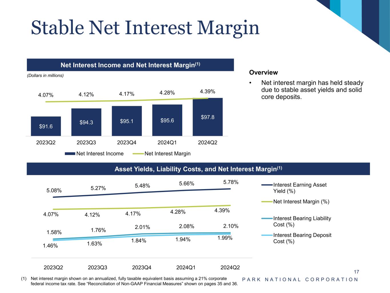 Efficiency Ratio & Non-Int. Exp. / Avg. Assets(1) Strong Earnings P A R K N A T I O N A L C O R P O R A T I O N 16 (Dollars in millions) Net Income, ROAA & ROATE(1) Non-Interest Income / Operating Revenue Pre-Tax, Pre-Provision Net Income / Avg. Assets(1) (1) See Reconciliation of Non-GAAP Financial Measures shown on pages 35 and 36. (Dollars in millions) (Dollars in millions) $153.9$153.9 62.8% 61.3% 61.2% 65.9% 61.1% 3.10% 2.88% 2.97% 3.11% 3.12% 2020Y 2021Y 2022Y 2023Y 2024 YTD Efficiency Ratio Non-Int. Exp. / Avg. Assets $127.9 $153.9 $148.4 $126.7 $74.6 1.4% 1.6% 1.5% 1.3% 1.5% 15.3% 17.2% 16.3% 13.6% 15.0% – $20.0 $40.0 $60.0 $80.0 $100.0 $120.0 $140.0 $160.0 2020Y 2021Y 2022Y 2023Y 2024Q2 – 4.0% 8.0% 12.0% 16.0% 20.0% Net Income ROAA ROATE $125.7 $129.9 $135.9 $92.6 $55.0 $327.6 $329.9 $347.1 $373.1 $193.5 27.7% 28.3% 28.1% 19.9% 22.1% 2020Y 2021Y 2022Y 2023Y 2024Q2 Net Interest Income Non-Interest Income Non-Interest Income / Op. Rev. $166.7 $176.3 $185.0 $156.5 $96.0 1.80% 1.79% 1.84% 1.57% 1.96% – $20 .0 $40 .0 $60 .0 $80 .0 $10 0.0 $12 0.0 $14 0.0 $16 0.0 $18 0.0 $20 0.0 1.0 0% 1.2 0% 1.4 0% 1.6 0% 1.8 0% 2.0 0% 2.2 0% 2020Y 2021Y 2022Y 2023Y 2024Q2 PPNR PPNR/Avg. Assets