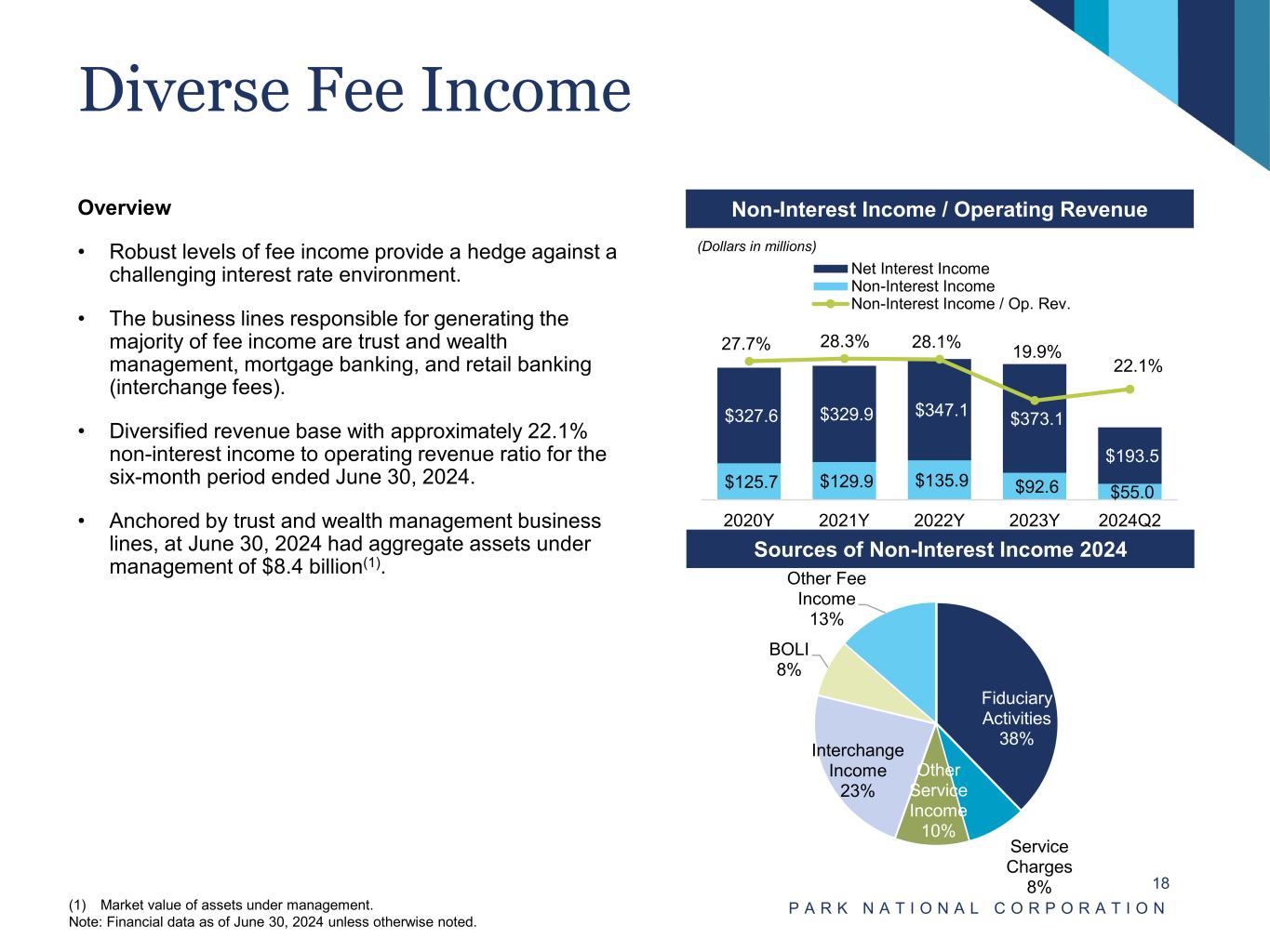 Stable Net Interest Margin P A R K N A T I O N A L C O R P O R A T I O N 17 Overview • Net interest margin has held steady due to stable asset yields and solid core deposits. Net Interest Income and Net Interest Margin(1) Asset Yields, Liability Costs, and Net Interest Margin(1) (Dollars in millions) (1) Net interest margin shown on an annualized, fully taxable equivalent basis assuming a 21% corporate federal income tax rate. See “Reconciliation of Non-GAAP Financial Measures” shown on pages 35 and 36. $91.6 $94.3 $95.1 $95.6 $97.8 4.07% 4.12% 4.17% 4.28% 4.39% 2023Q2 2023Q3 2023Q4 2024Q1 2024Q2 Net Interest Income Net Interest Margin 5.08% 5.27% 5.48% 5.66% 5.78% 4.07% 4.12% 4.17% 4.28% 4.39% 1.58% 1.76% 2.01% 2.08% 2.10% 1.46% 1.63% 1.84% 1.94% 1.99% 2023Q2 2023Q3 2023Q4 2024Q1 2024Q2 Interest Earning Asset Yield (%) Net Interest Margin (%) Interest Bearing Liability Cost (%) Interest Bearing Deposit Cost (%)