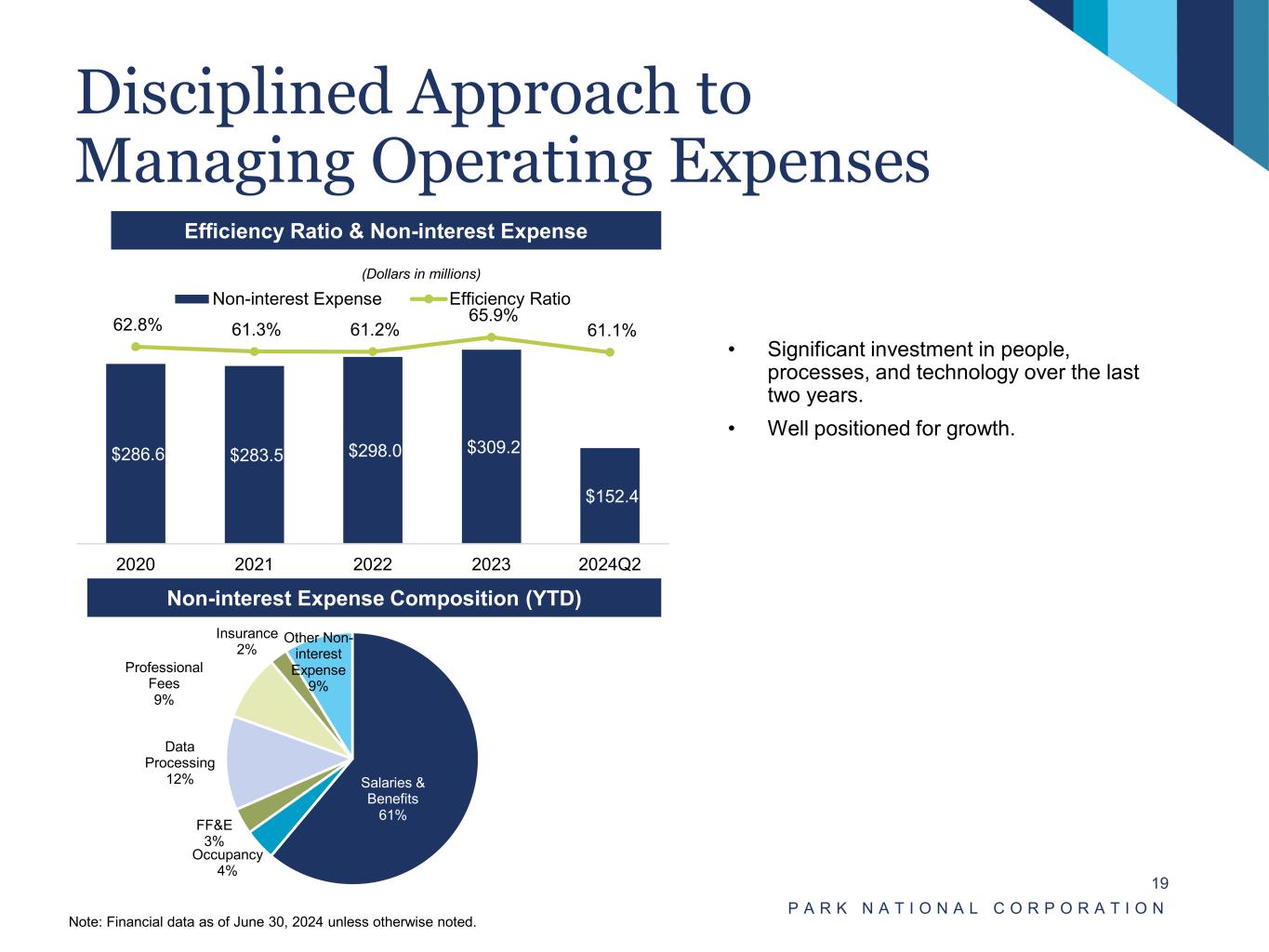 Diverse Fee Income P A R K N A T I O N A L C O R P O R A T I O N 18 Overview • Robust levels of fee income provide a hedge against a challenging interest rate environment. • The business lines responsible for generating the majority of fee income are trust and wealth management, mortgage banking, and retail banking (interchange fees). • Diversified revenue base with approximately 22.1% non-interest income to operating revenue ratio for the six-month period ended June 30, 2024. • Anchored by trust and wealth management business lines, at June 30, 2024 had aggregate assets under management of $8.4 billion(1). Sources of Non-Interest Income 2024 Non-Interest Income / Operating Revenue (1) Market value of assets under management. Note: Financial data as of June 30, 2024 unless otherwise noted. (Dollars in millions) $125.7 $129.9 $135.9 $92.6 $55.0 $327.6 $329.9 $347.1 $373.1 $193.5 27.7% 28.3% 28.1% 19.9% 22.1% 2020Y 2021Y 2022Y 2023Y 2024Q2 Net Interest Income Non-Interest Income Non-Interest Income / Op. Rev. Fiduciary Activities 38% Service Charges 8% Other Service Income 10% Interchange Income 23% BOLI 8% Other Fee Income 13%
