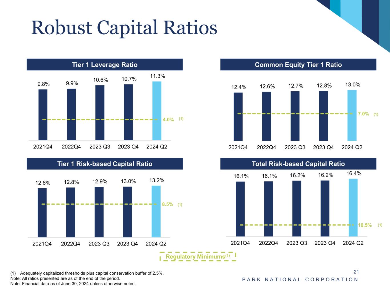 High Quality Capital Structure 99% of Park’s Tier 1 Capital is Common Equity P A R K N A T I O N A L C O R P O R A T I O N 20 Common Equity Tier 1 Trust Preferred Receives full Tier 1 Capital treatment Subordinated Notes and Allowance for Credit Losses Tier 1 Capital $1,101.8 million Tier 2 Capital $266.2 million Note: Financial data as of June 30, 2024 unless otherwise noted. ACL $91.8 Subdebt $174.4 Trust Preferred $15.0 Common Equity Tier 1 $1,086.8 1 Regulatory Capital at June 30, 2024 (Dollars in millions)